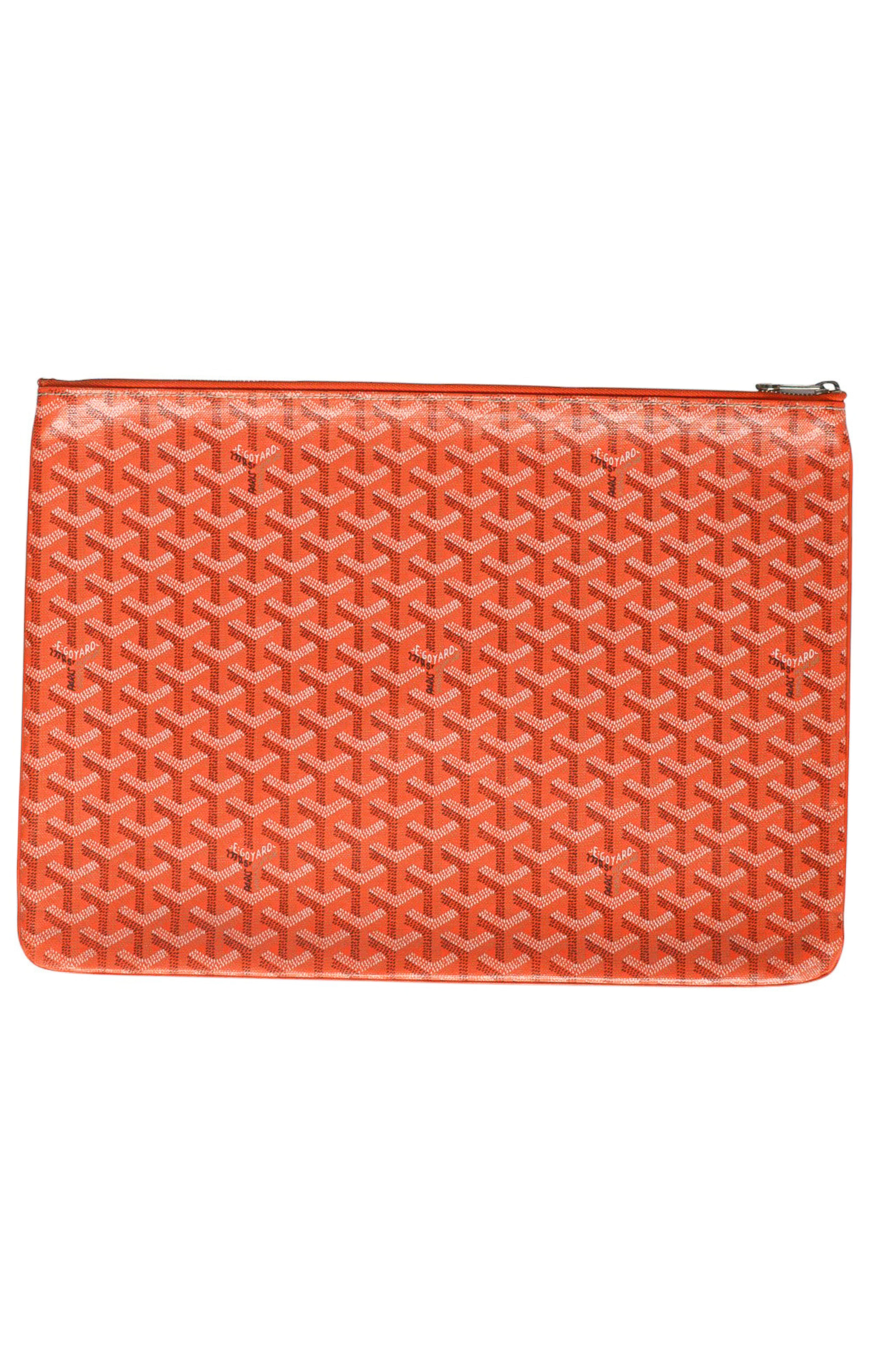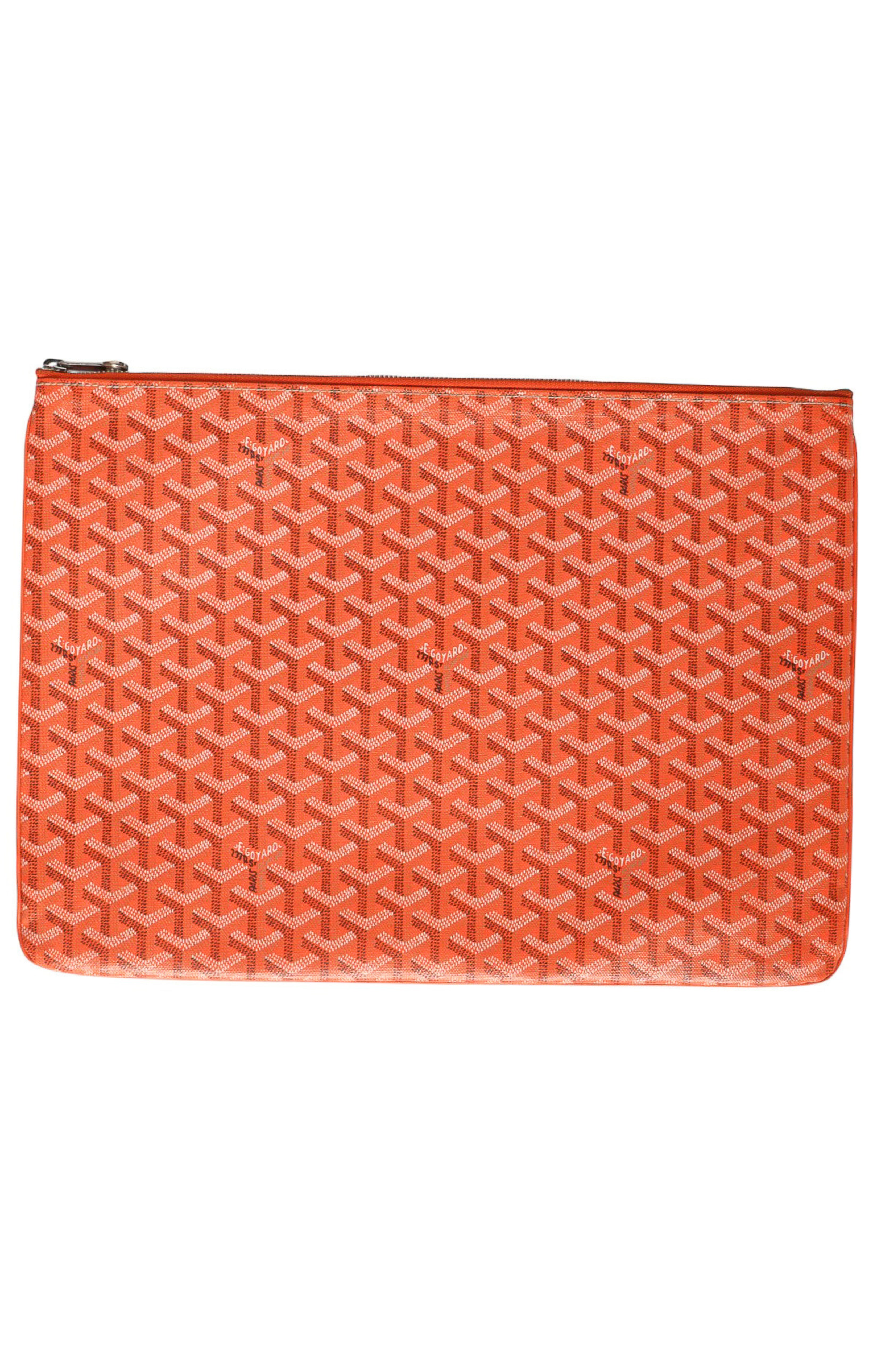 RARE limited edition style; Orange with tan/white/black logo print, coated canvas oversized clutch bag with silver-tone metal logo hardware; Zipper closure
