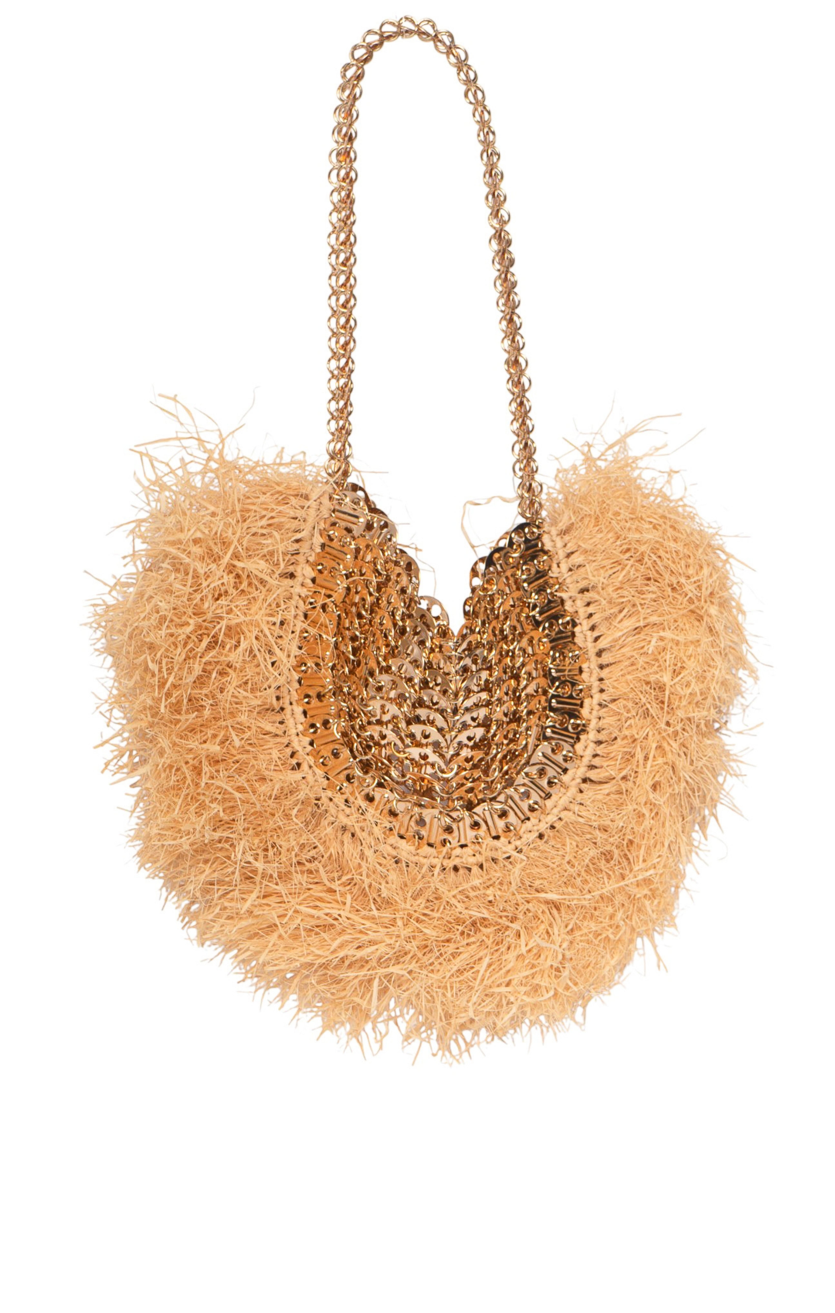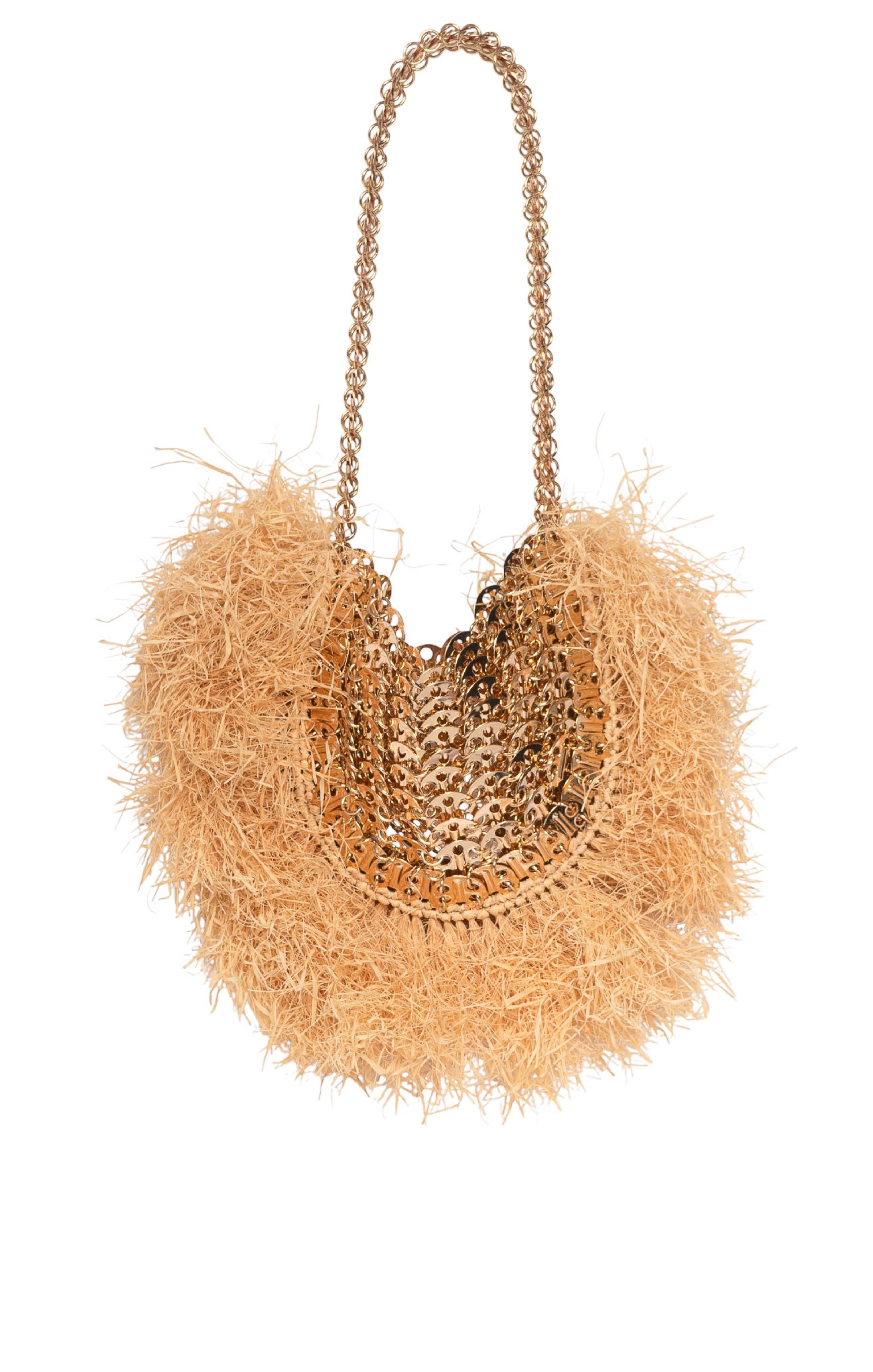 Gold-tone metal mini disc bag with beige straw exterior trim, singular top handle, and open top