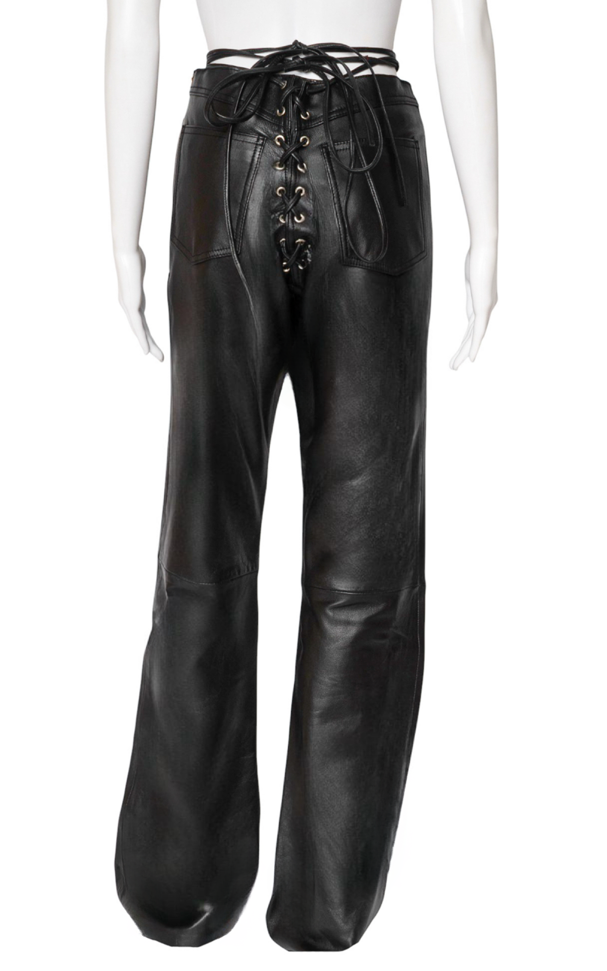 Black leather double-sided lace up pants with cut off waist, silver-tone metal hardware, seam detailing, and flared hem; Side zipper and tie closure