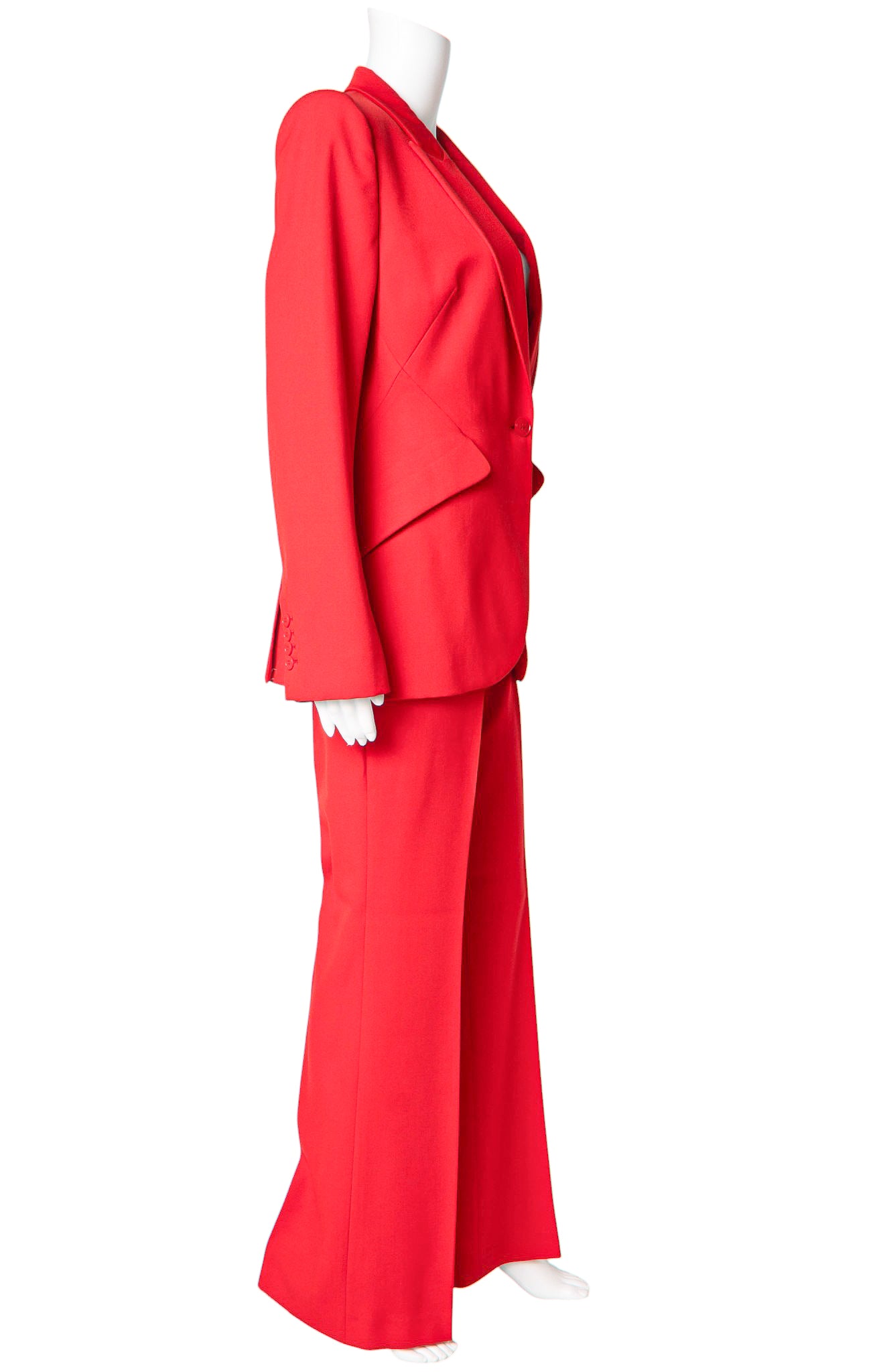 Limited edition color; Red wool blazer jacket and matching trousers; Jacket is single-breasted with shoulder pads, signature double pocket detailing and back vented hem; Pants are mid rise with pleated flared legs, pockets, belt loops, and button/hook & eye/zipper closure