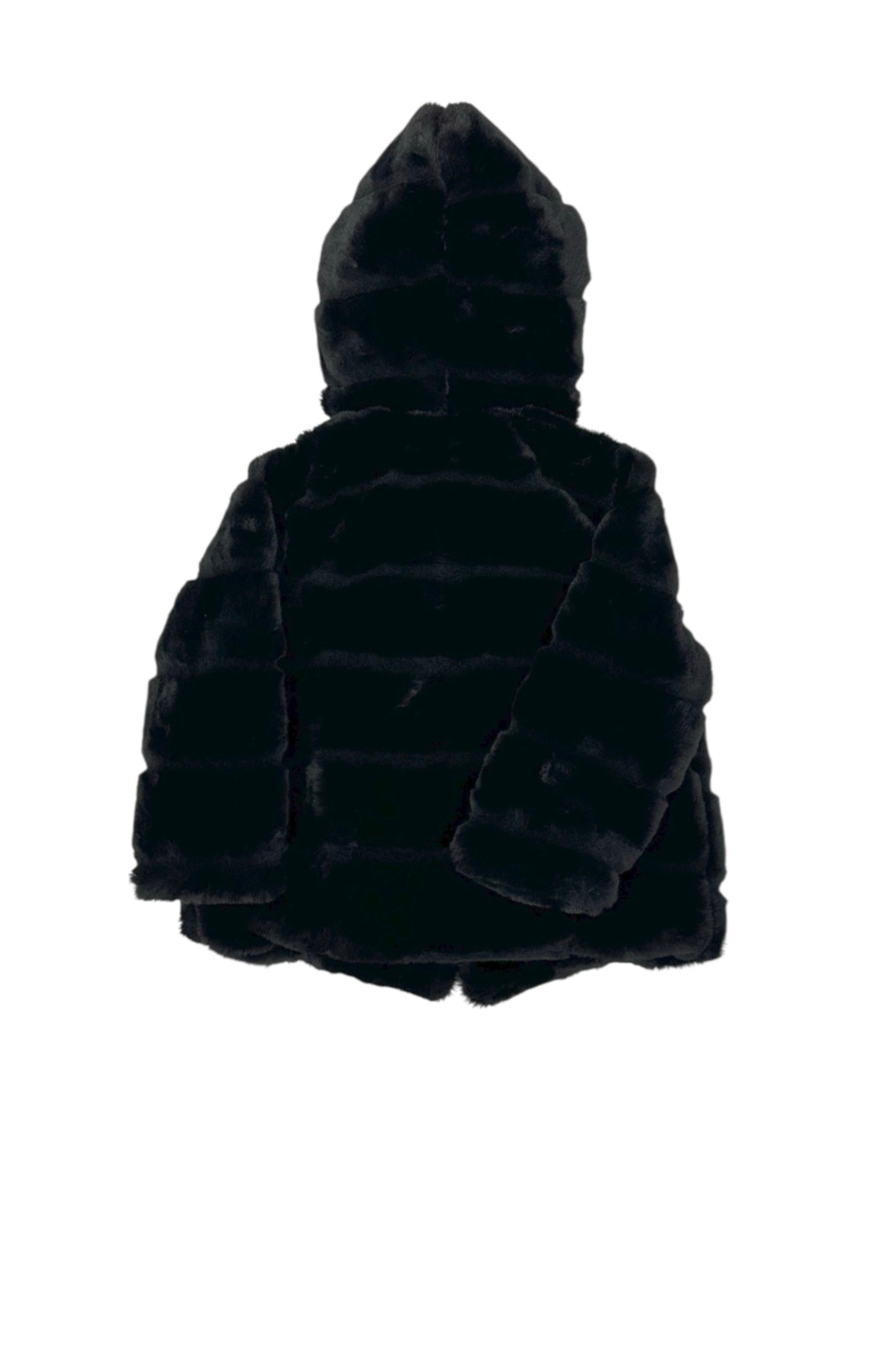 Black ribbed faux fur coat with hood, pockets, and snap button closure
