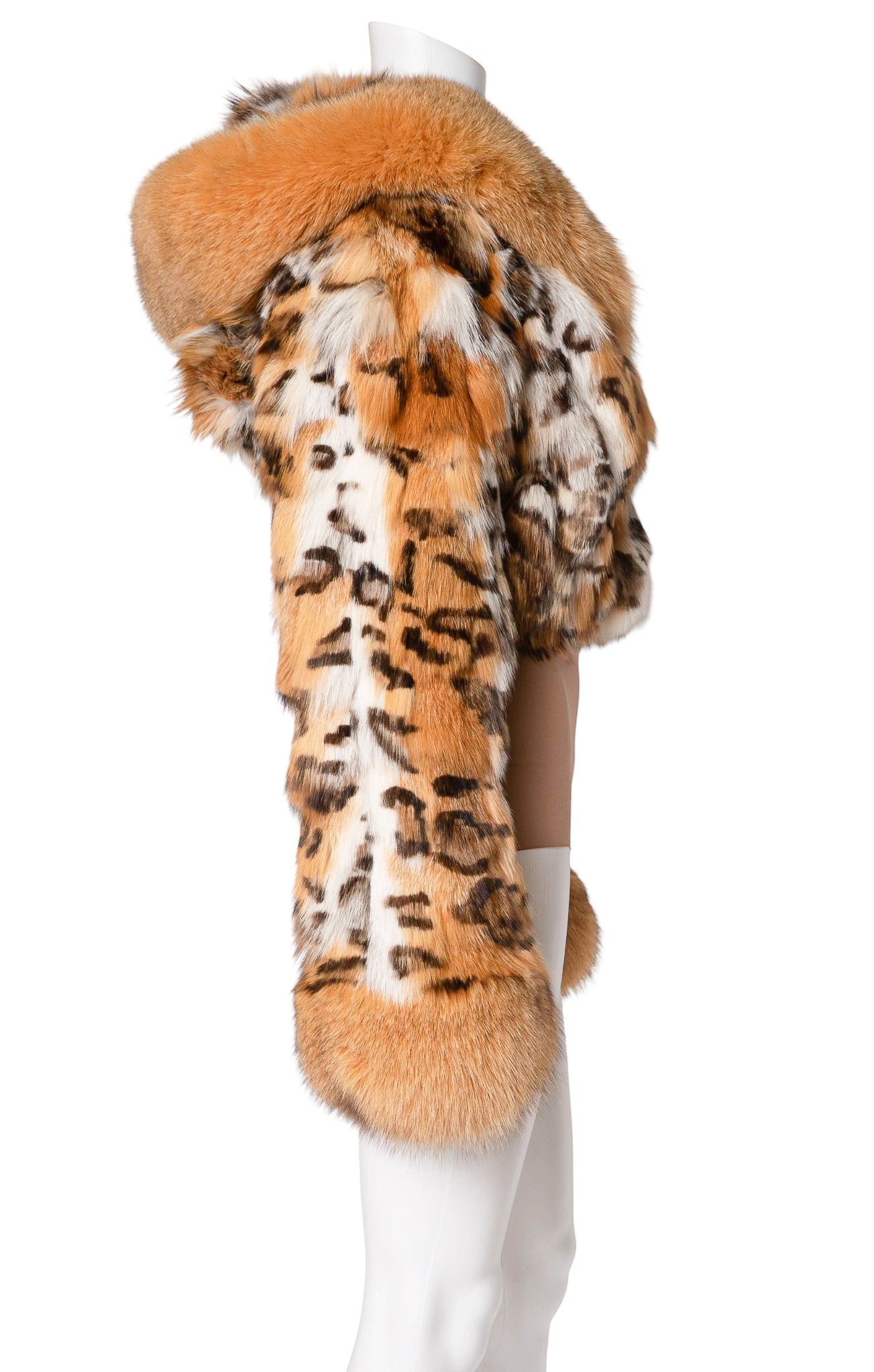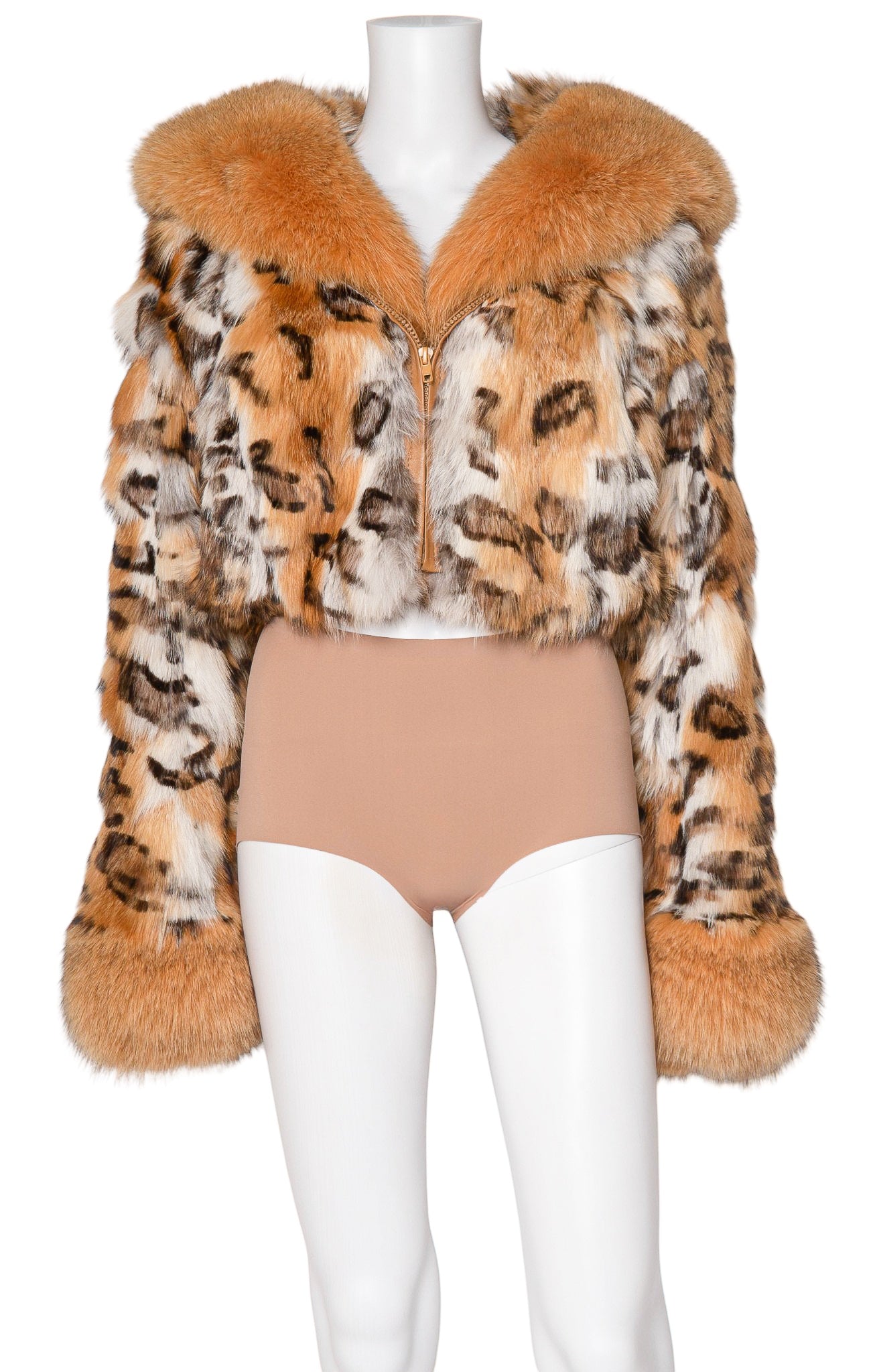 RARE limited edition style; Cognac, white, black and brown leopard-printed, semi-cropped fur jacket with hood, cognac leather trim, pockets, and fleece-lining; Zipper closure