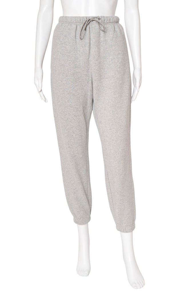 Heather grey, fleece-lined, semi-cropped sweatpants with white embroidered satin logo, zipper pockets, drawstring elastic waistband, and elastic ankles