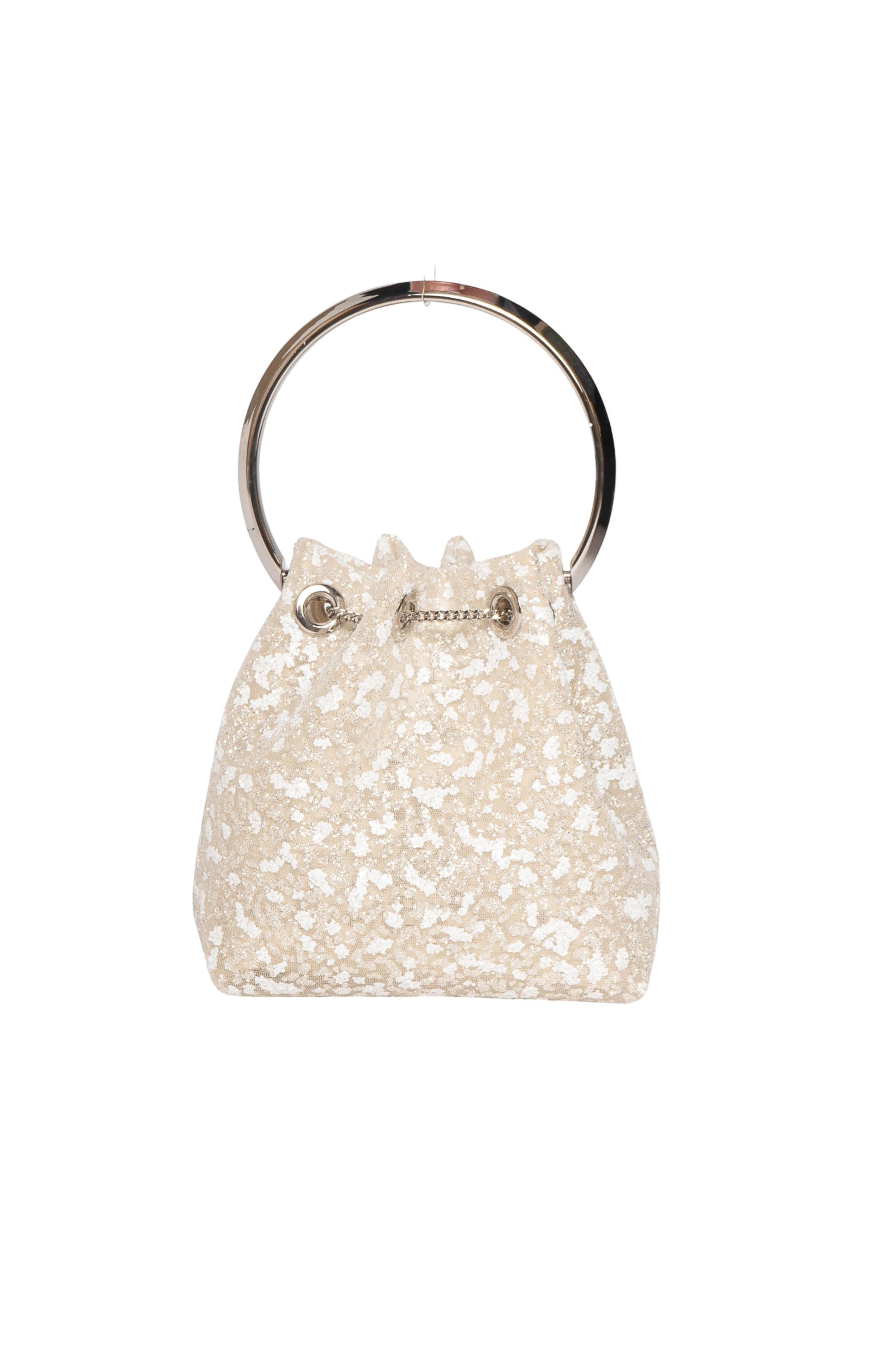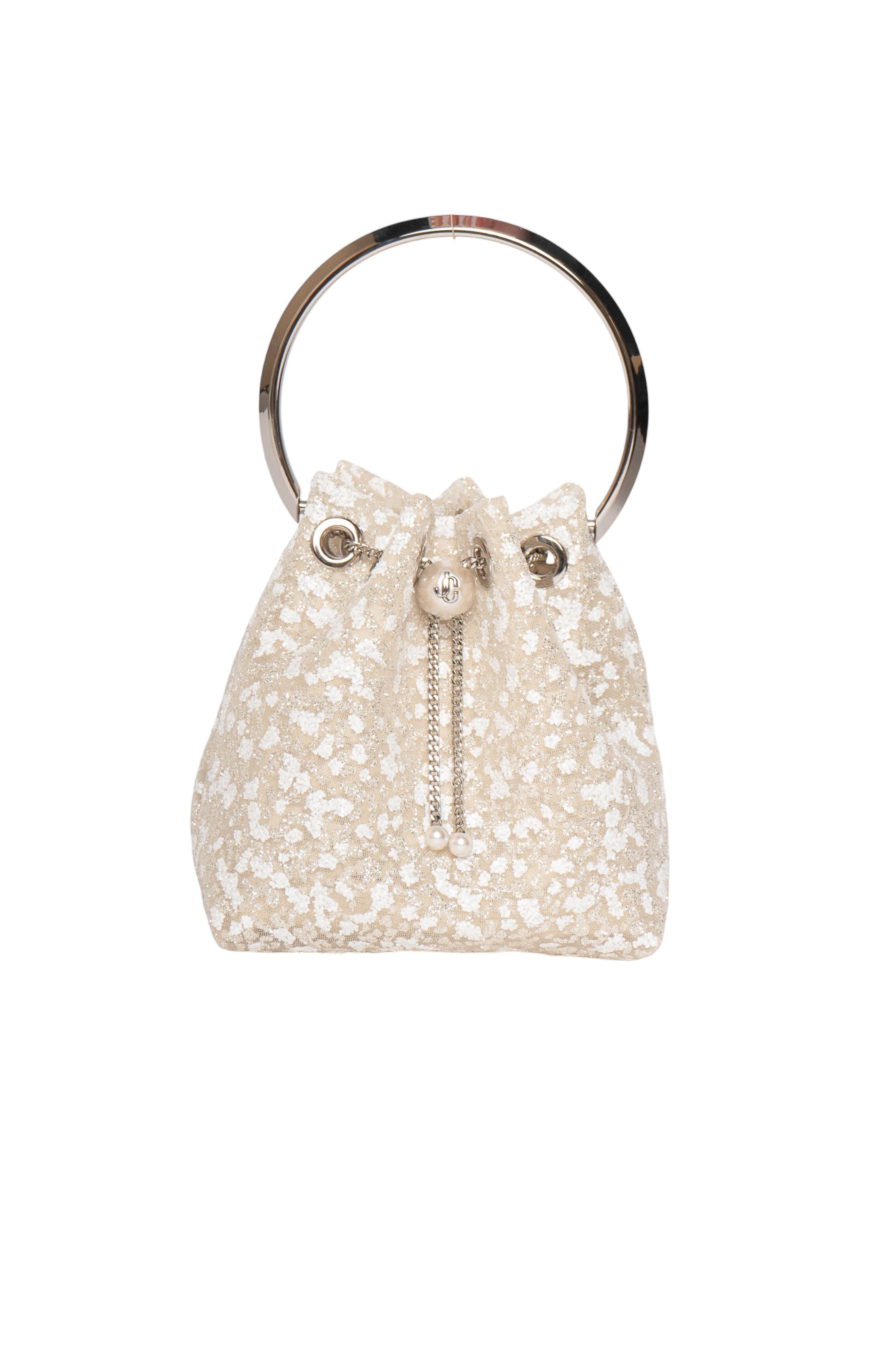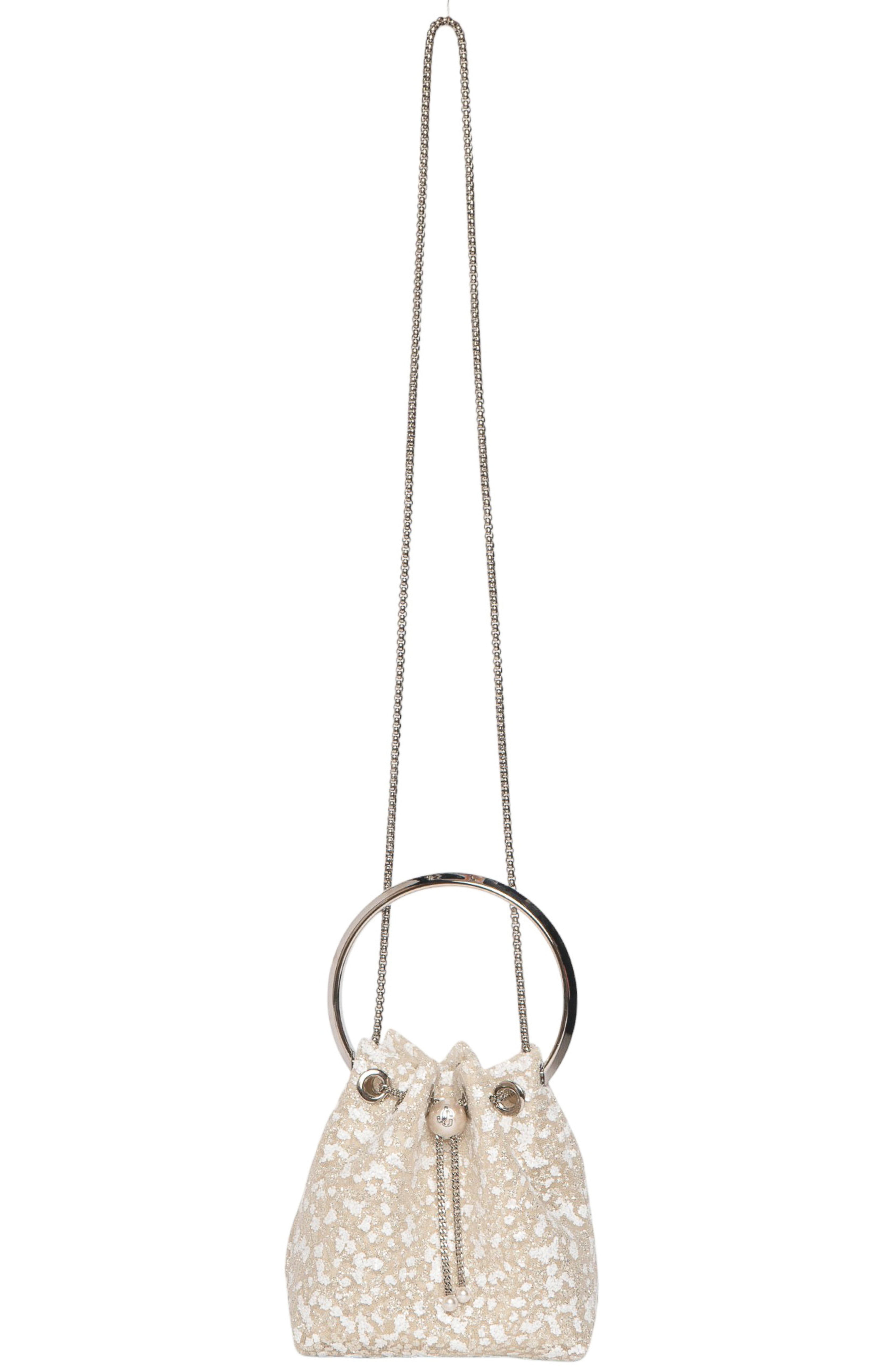 Ivory mesh mini handbag with silver and white glitter appliqué, silver-tone metal hardware (top handle, hanging tassels, and strap) and faux pearl detailing on drawstring; Metal drawstring closure and 20.5" shoulder strap