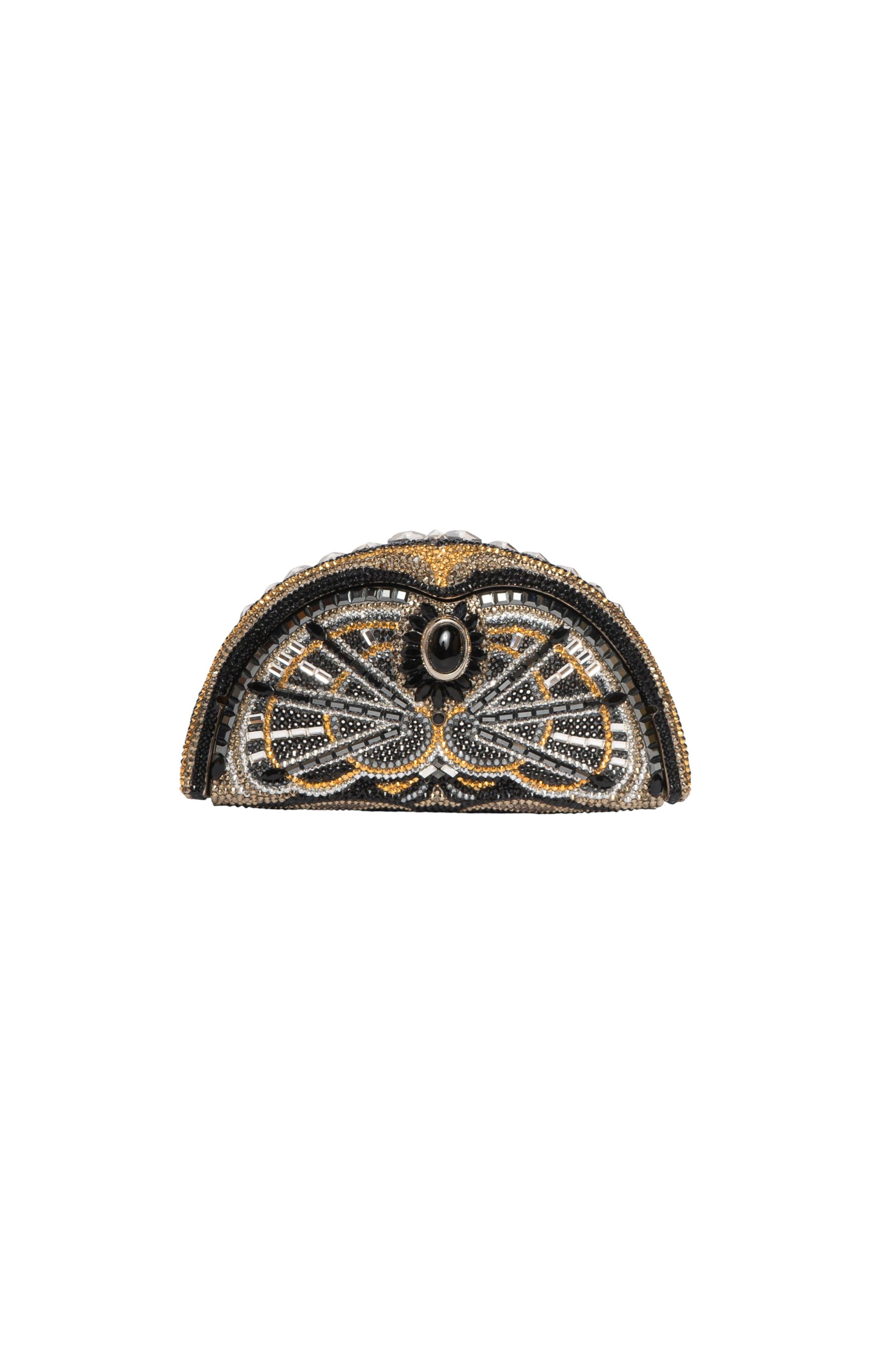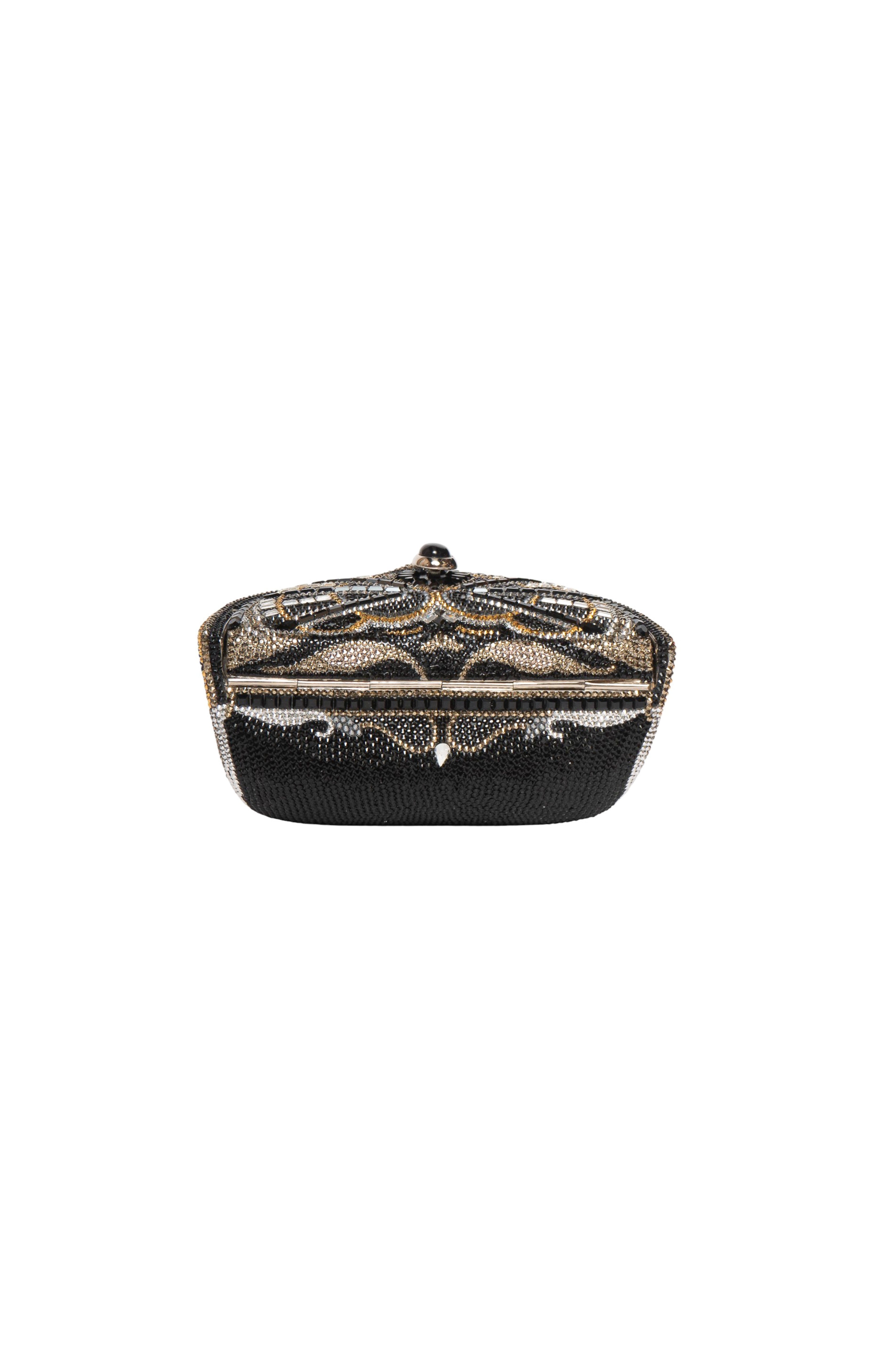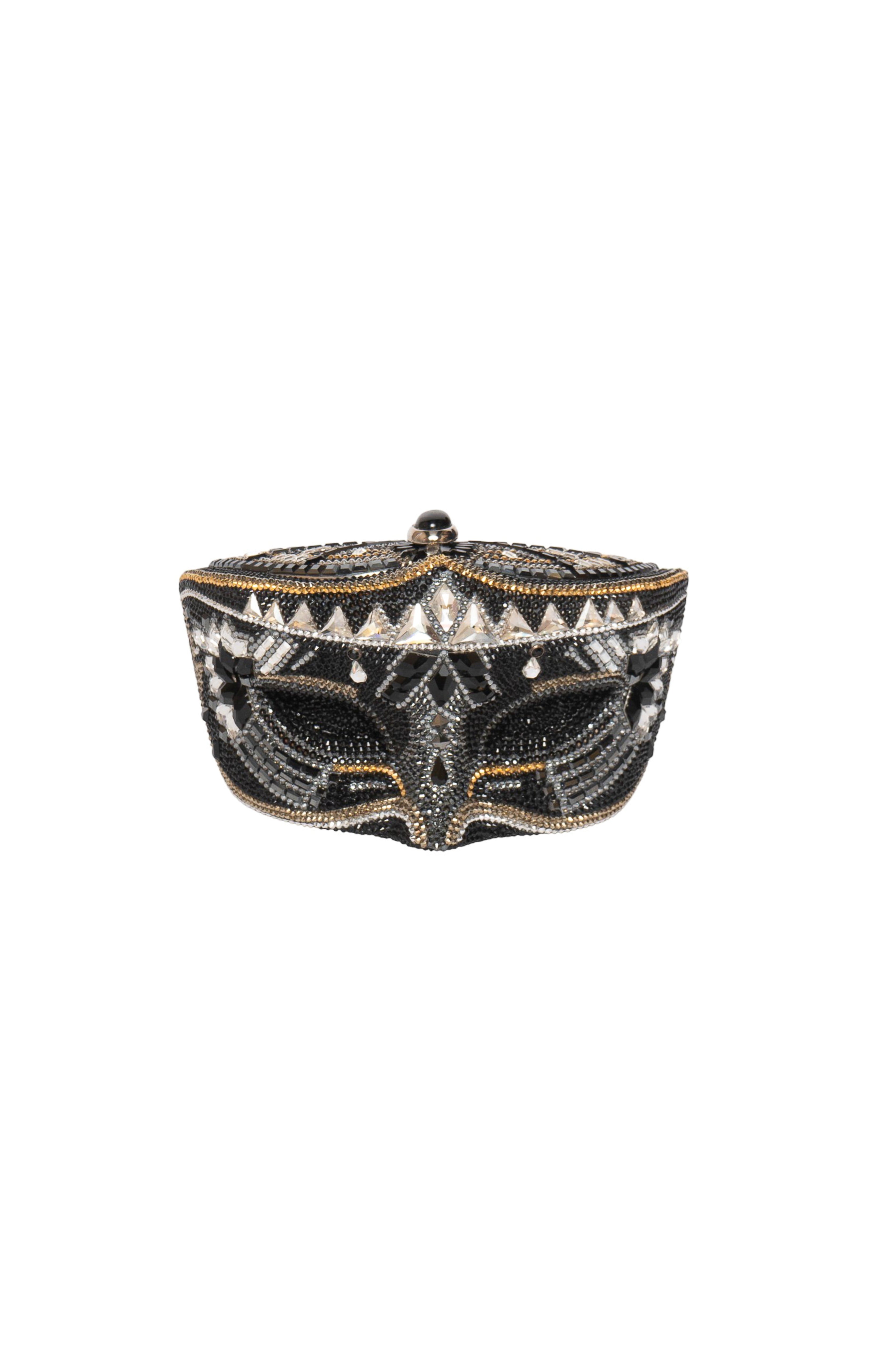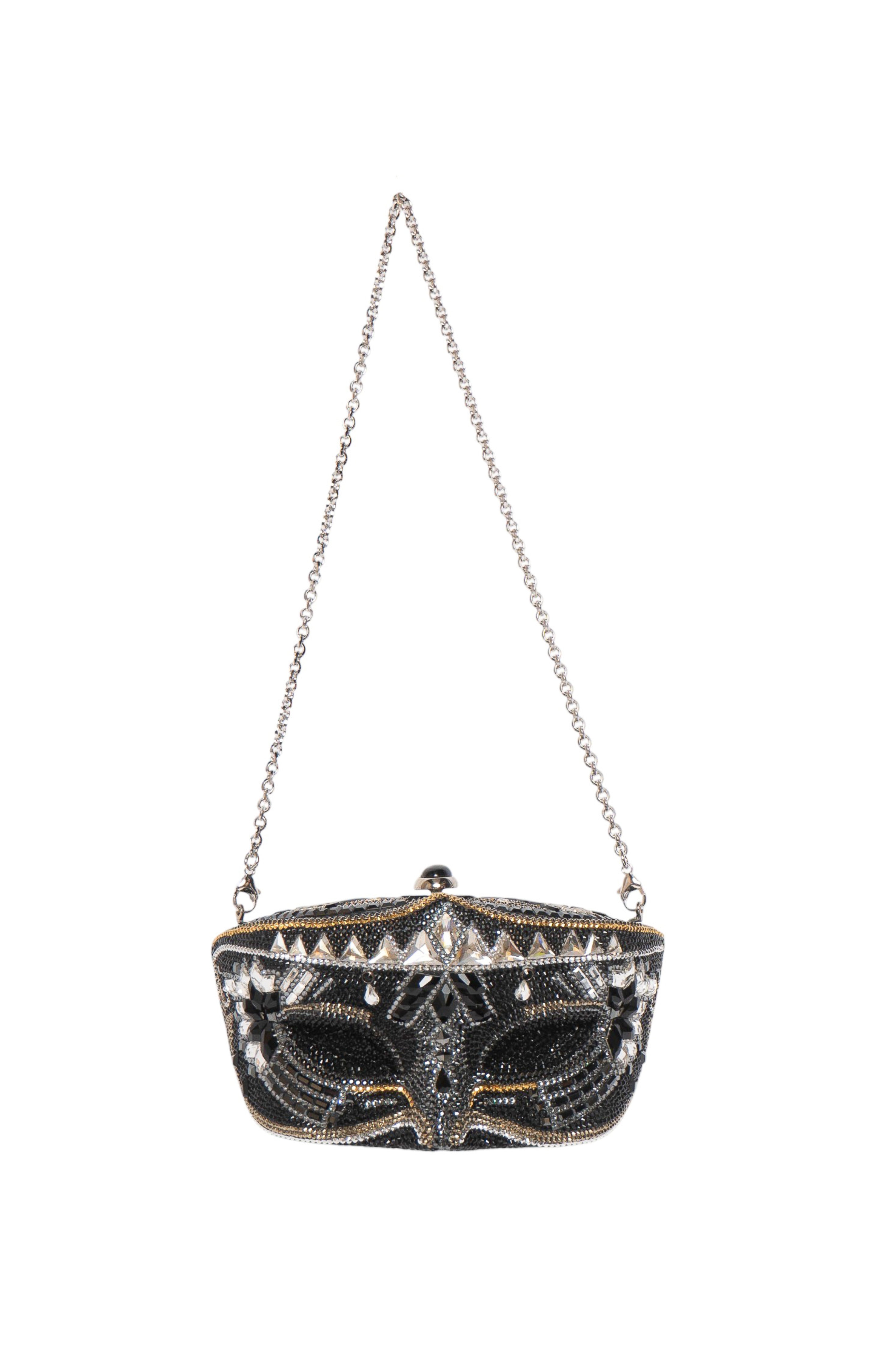 RARE limited edition style; Black, gold, charcoal and silver crystal-encrusted Bal Masque minaudière clutch or shoulder bag with silver-tone metal hardware and hidden chain strap, and top silver-tone metal and black resin slide lock detail; Snap closure