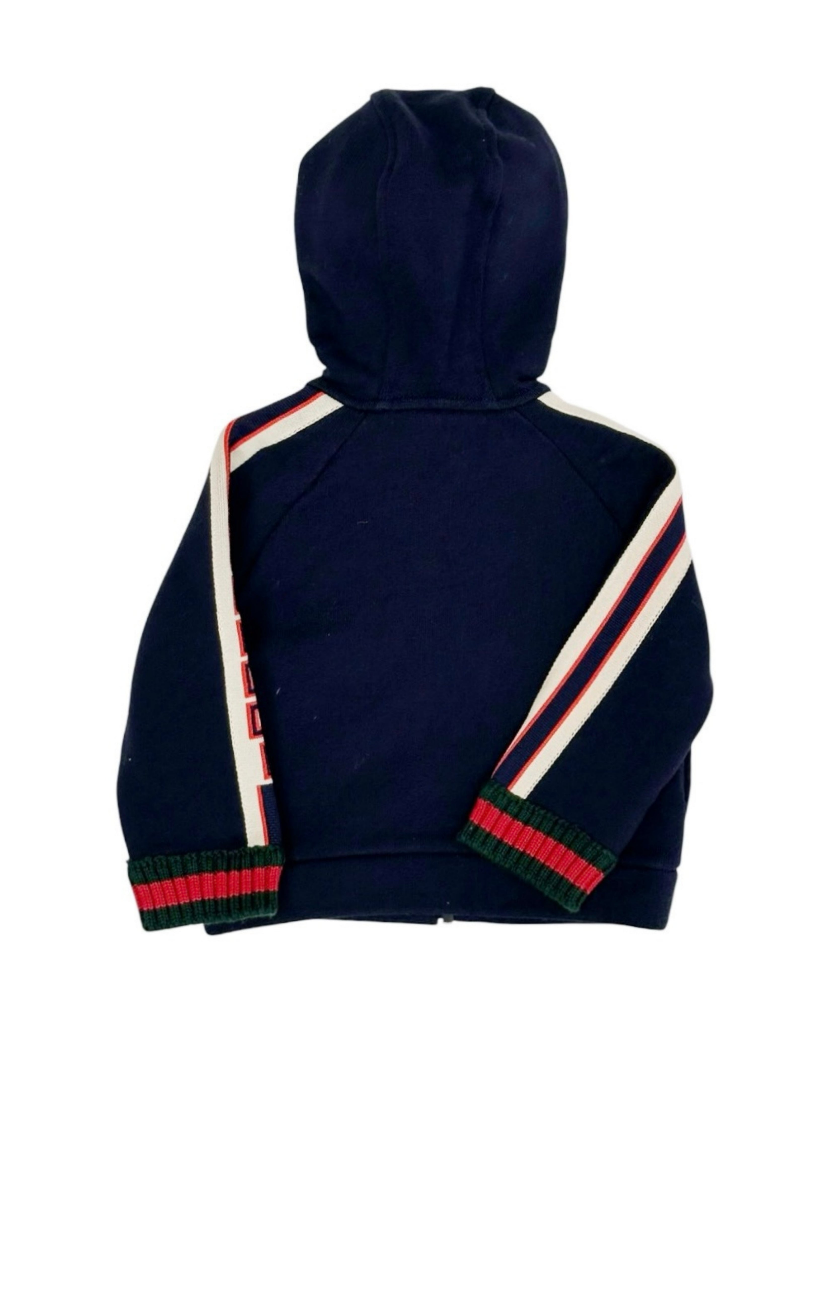 Limited edition style; Navy zip up sweatshirt with hood, cream, navy and red embroidered logo stripes on sleeves, green and red striped embroidered trim, pockets, and brushed silver-tone metal logo hardware; Zipper closure