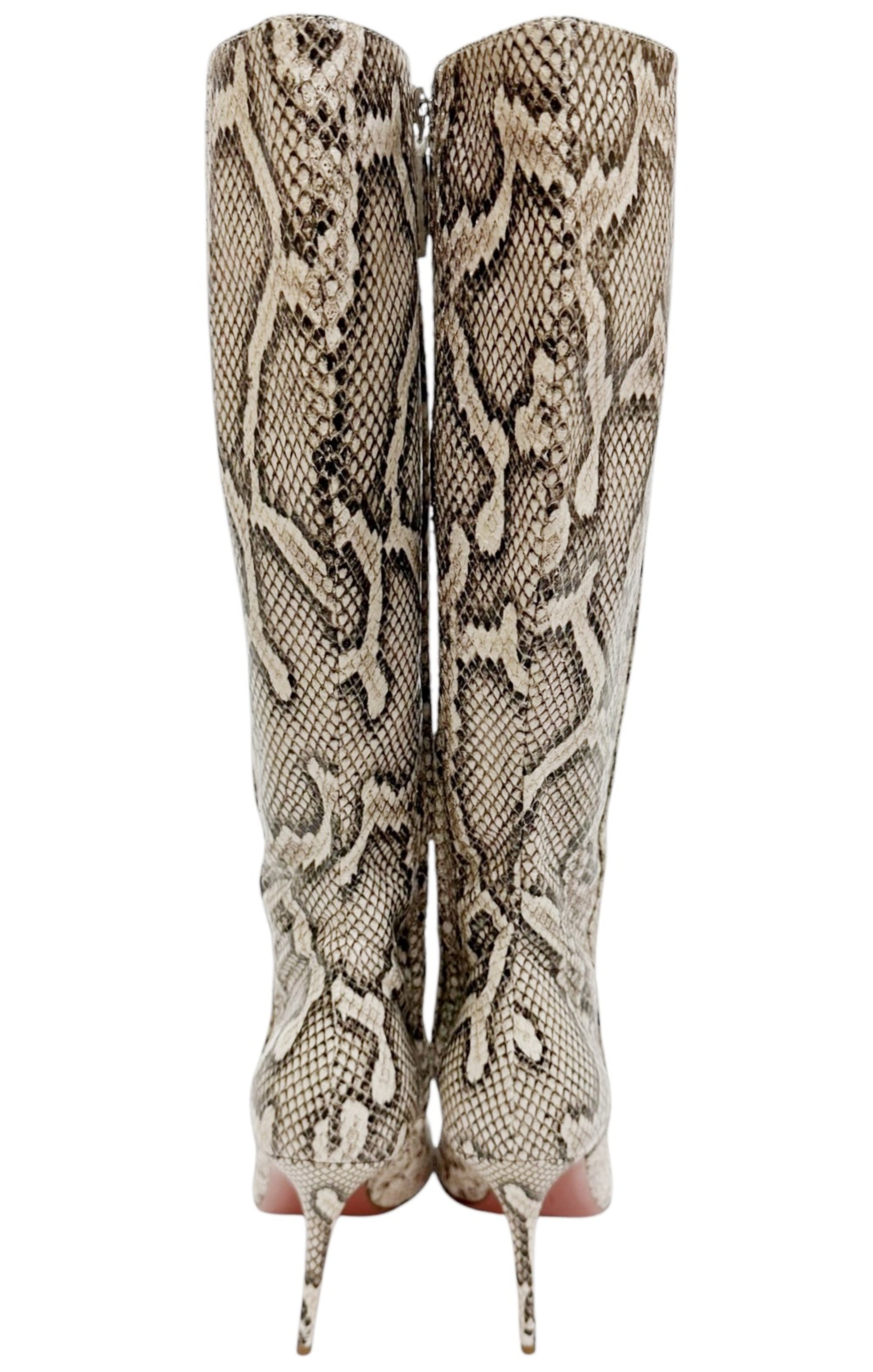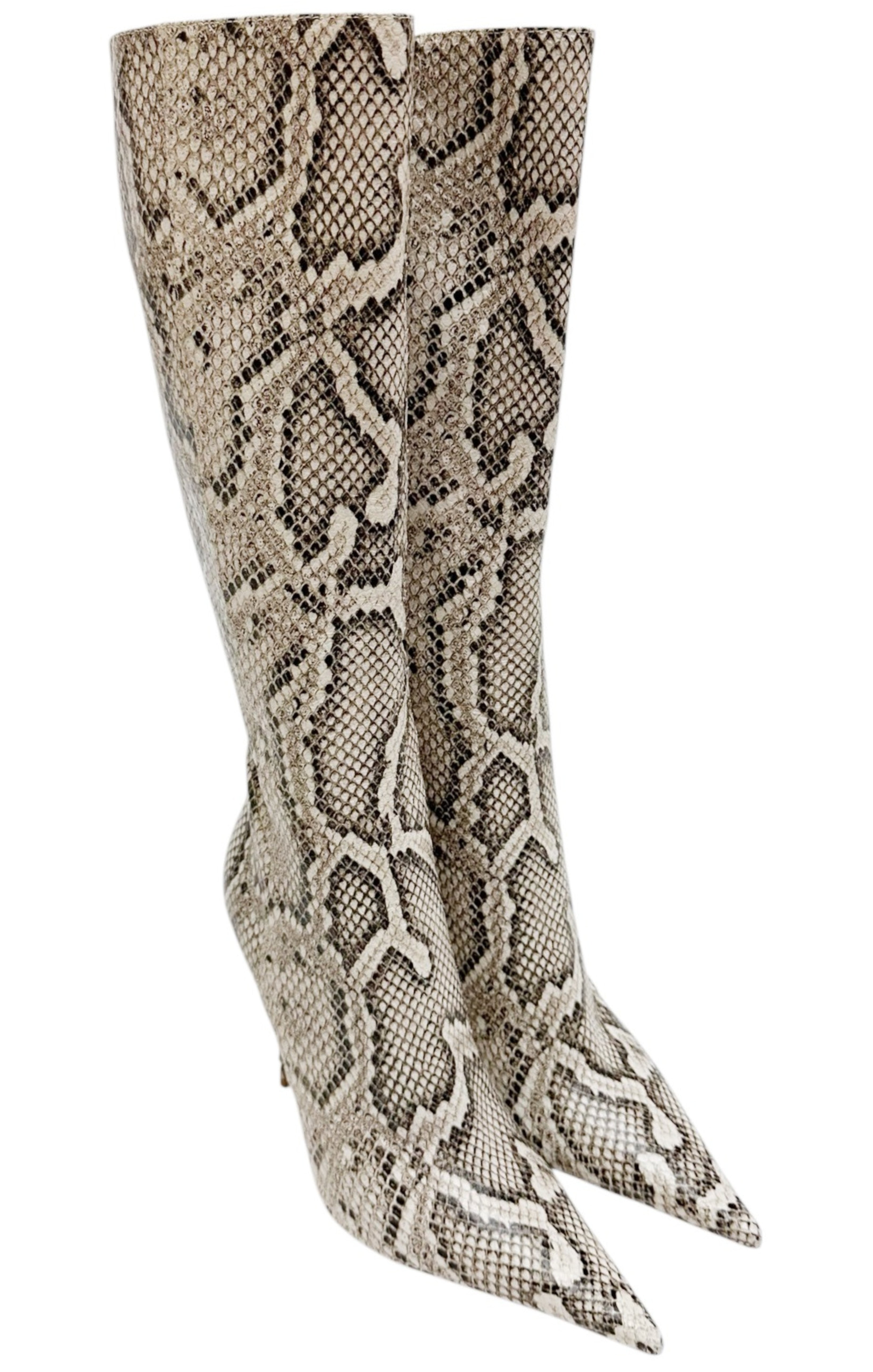 This style was worn by Kim in Venice, Italy during Summer 2025; White, grey and black python-embossed leather knee-high boots with pointed toe and stiletto heel; Side zipper closure and 4.25" heel