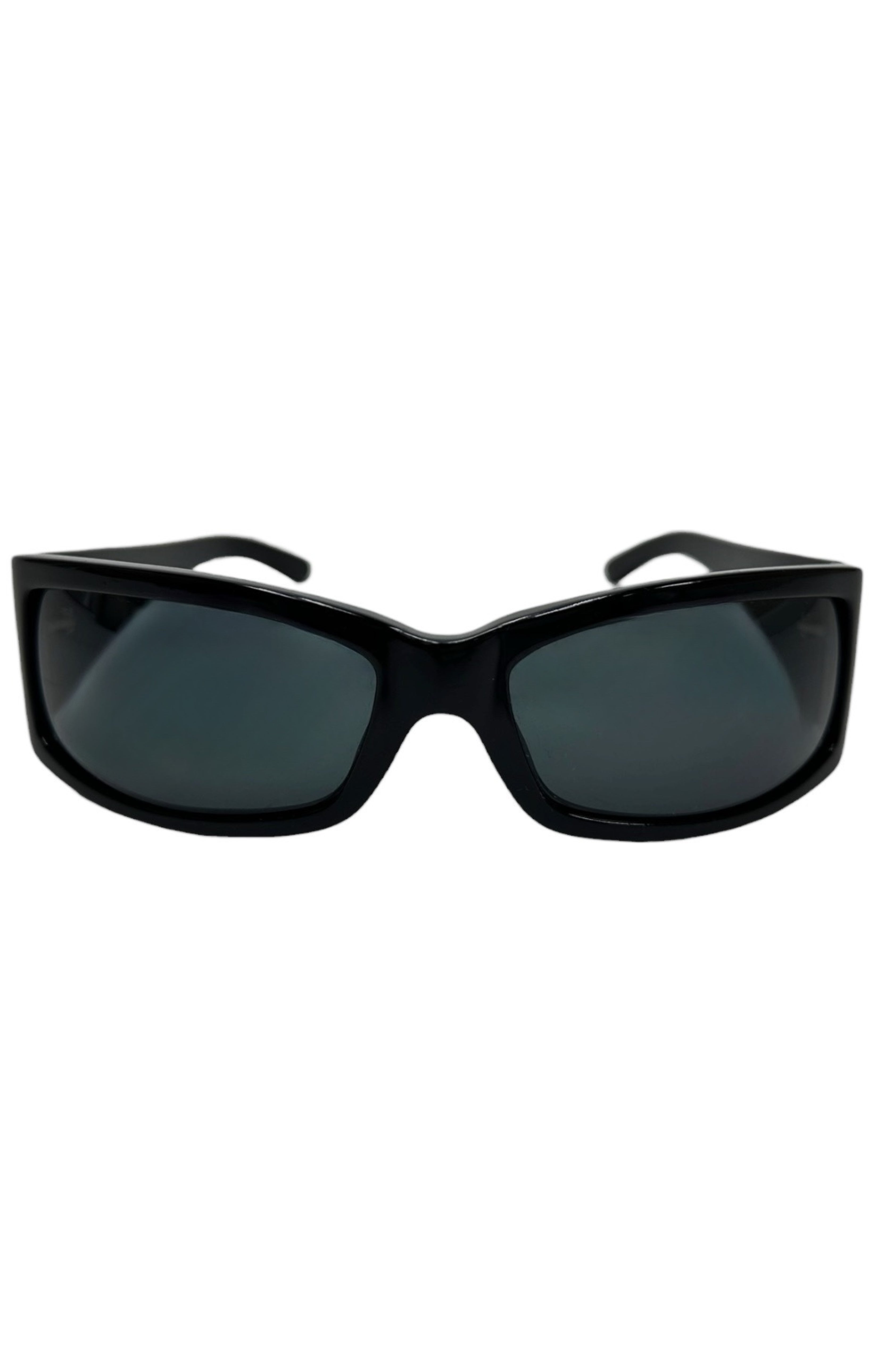 Limited edition style; Black sport wrap sunglasses with black/blue lenses, and silver-tone metal logo temple appliqué