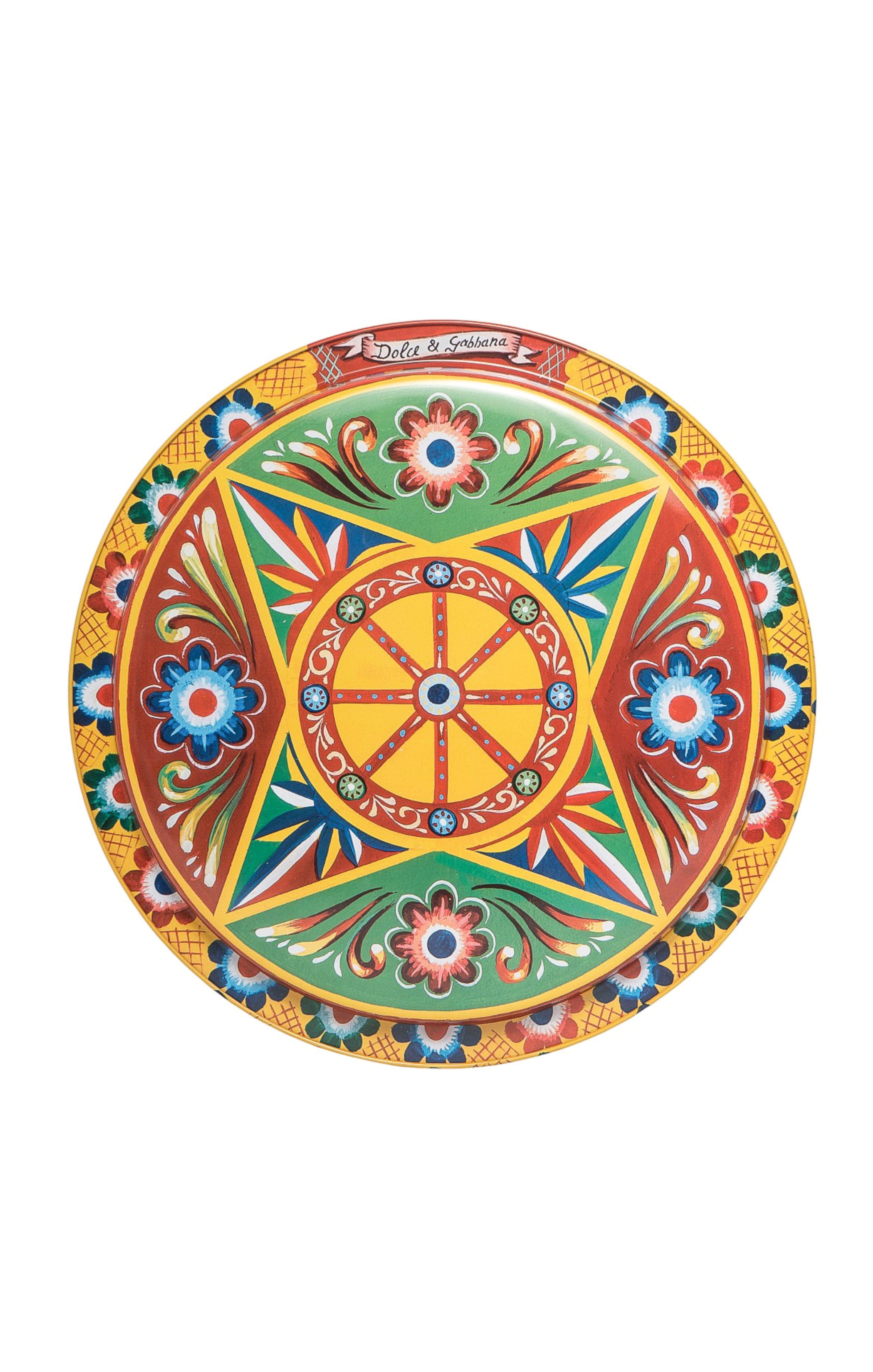 Rare limited edition style; Yellow metal decorative, circular tray with multicolored floral, graphic and logo print
