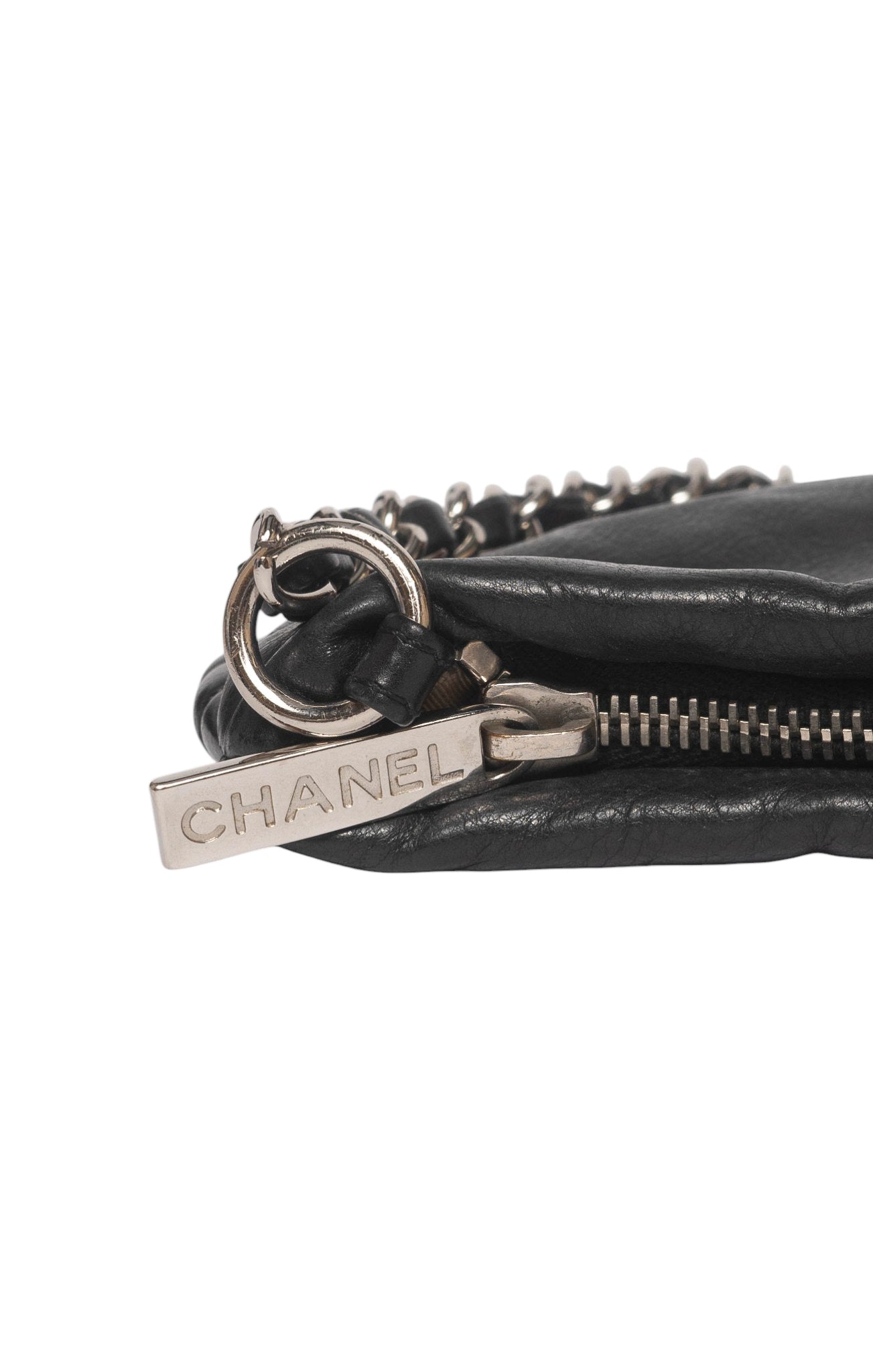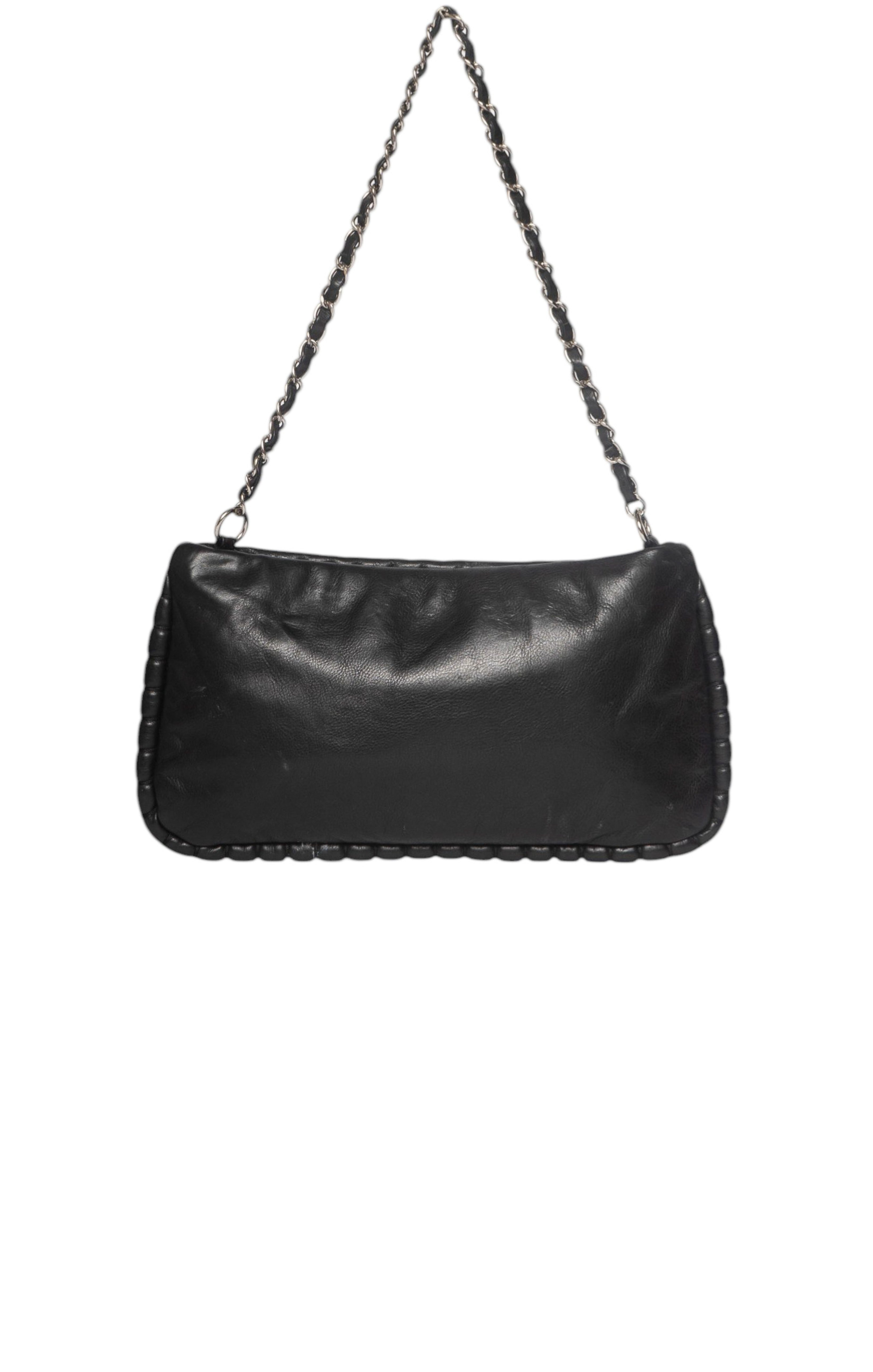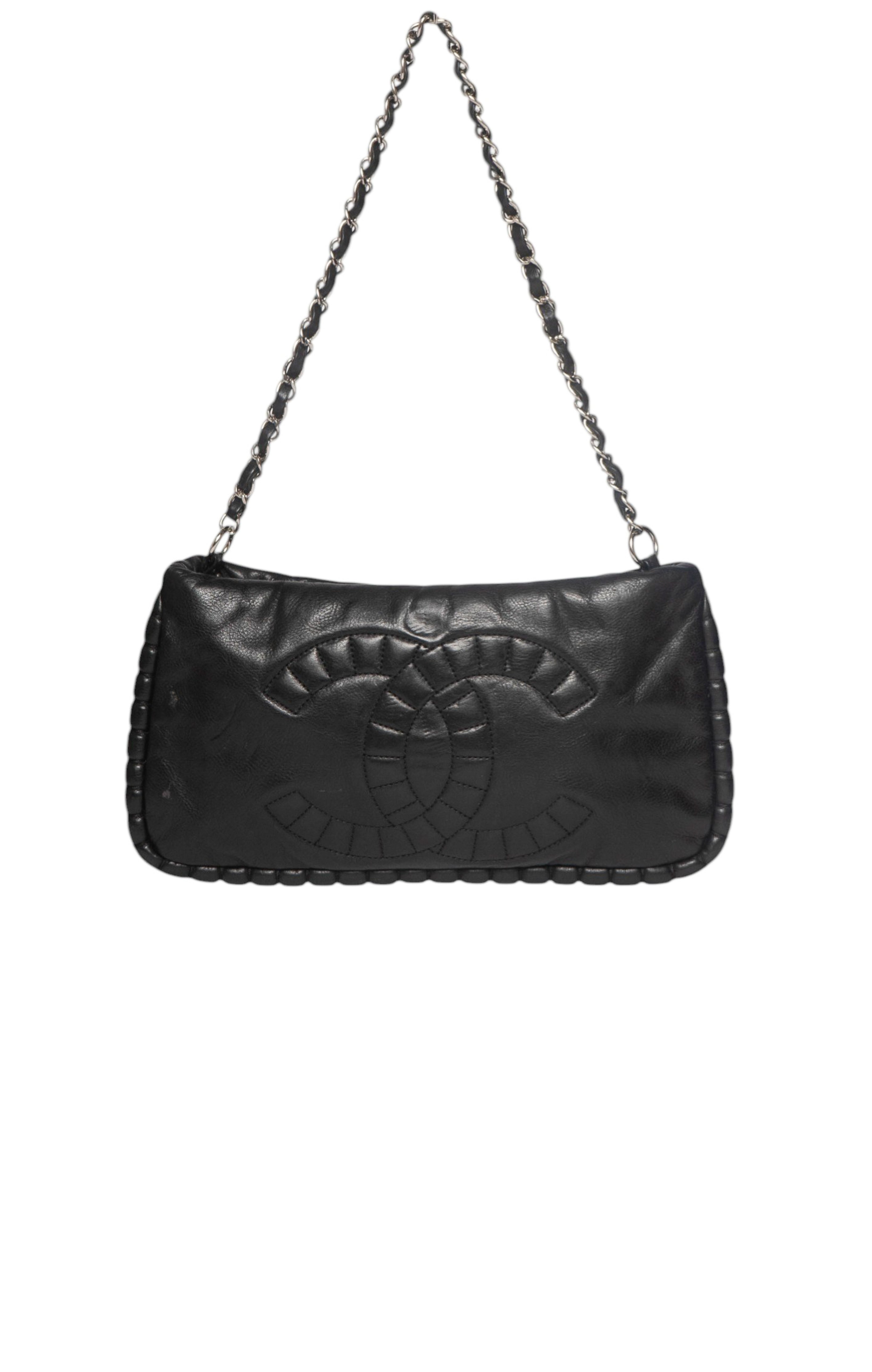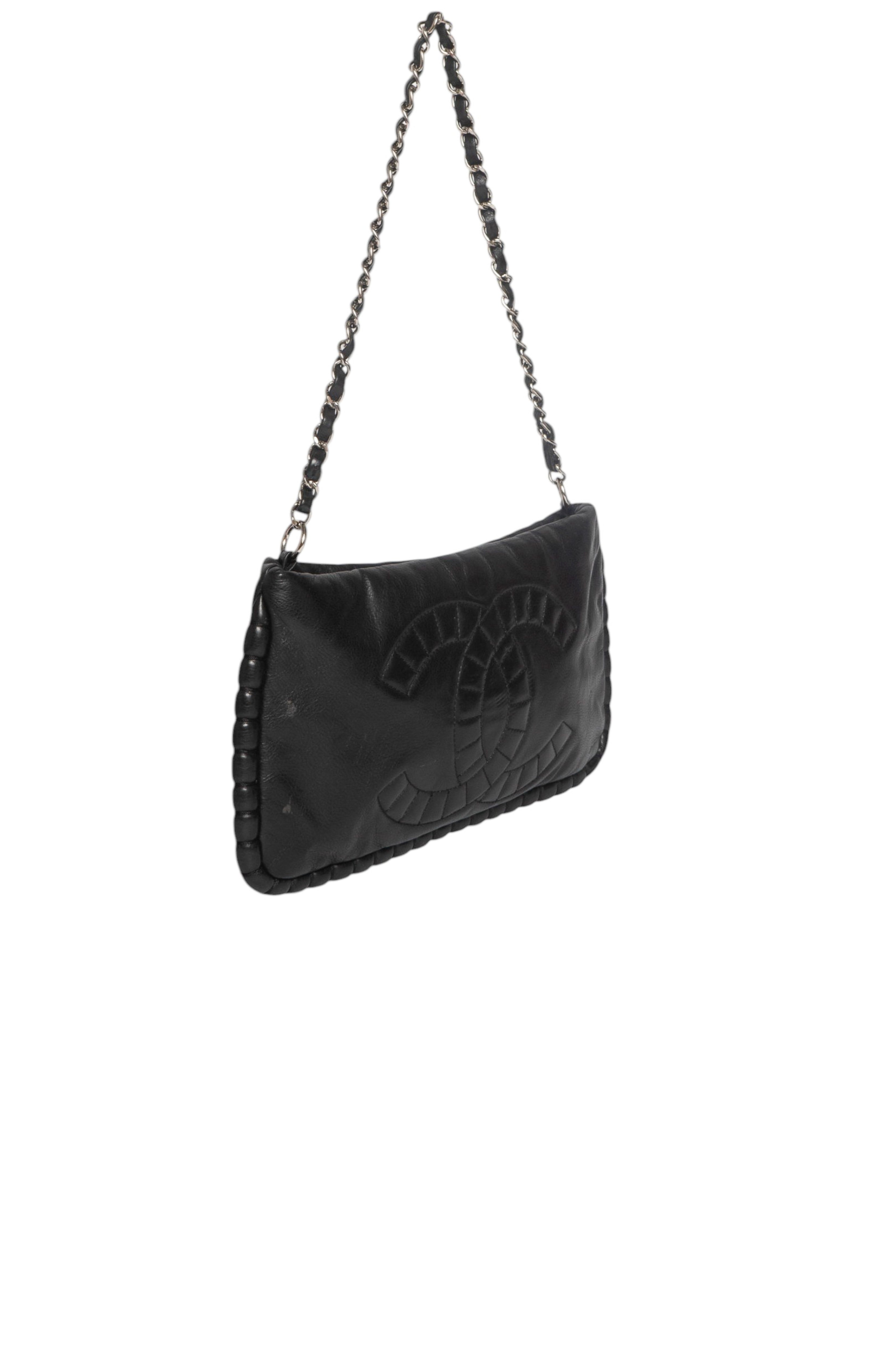 RARE limited edition style; Black pebbled leather shoulder bag with tufted trim detailing, CC logo embroidery, silver-tone metal logo-engraved hardware, silver-tone metal and black leather braided top strap, and zipper closure