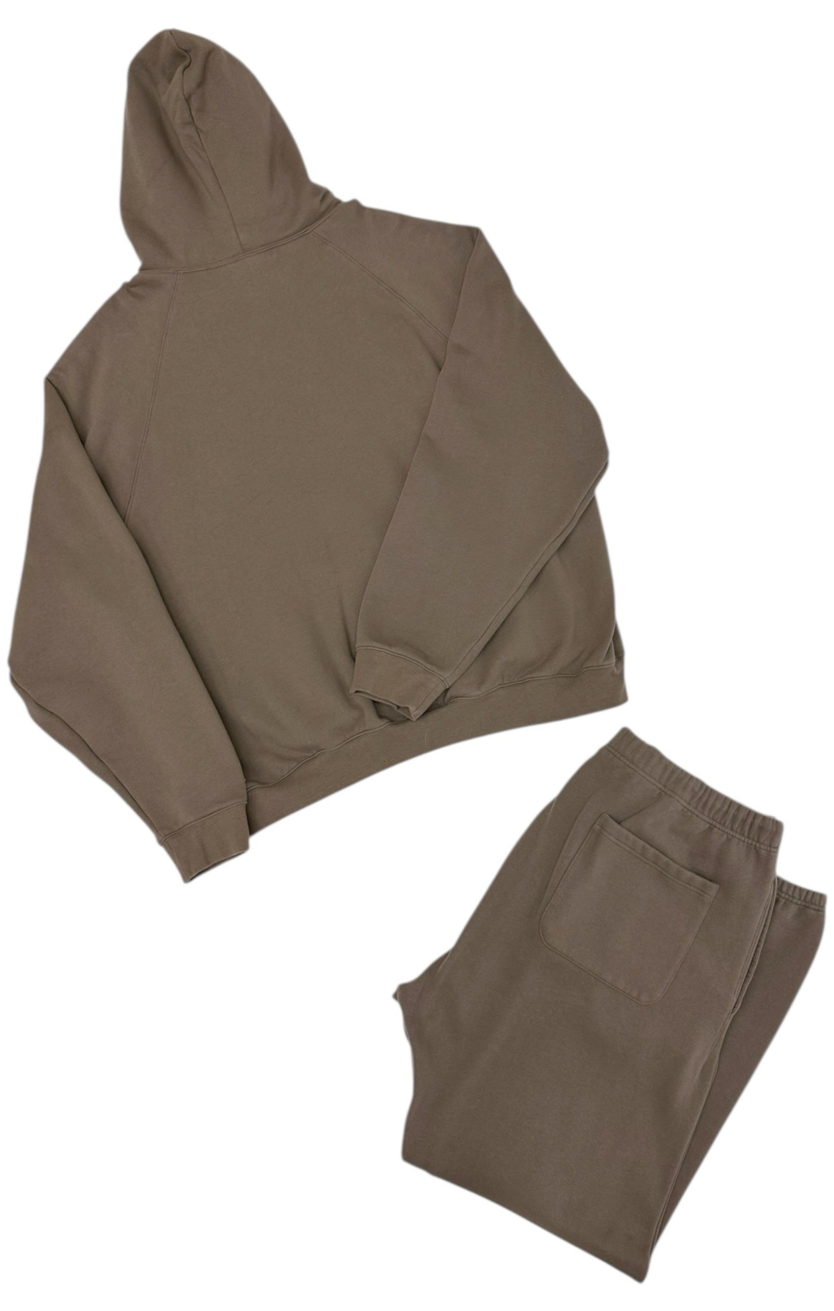 Limited edition style; Taupe fleece-lined sweatsuit; Top is a hoodie sweatshirt with front kangaroo pocket and clear/white rubber logo plaque on sleeve; Pants are jogger sweatpants with multi pockets, drawstring elastic waistband, and elastic ankles