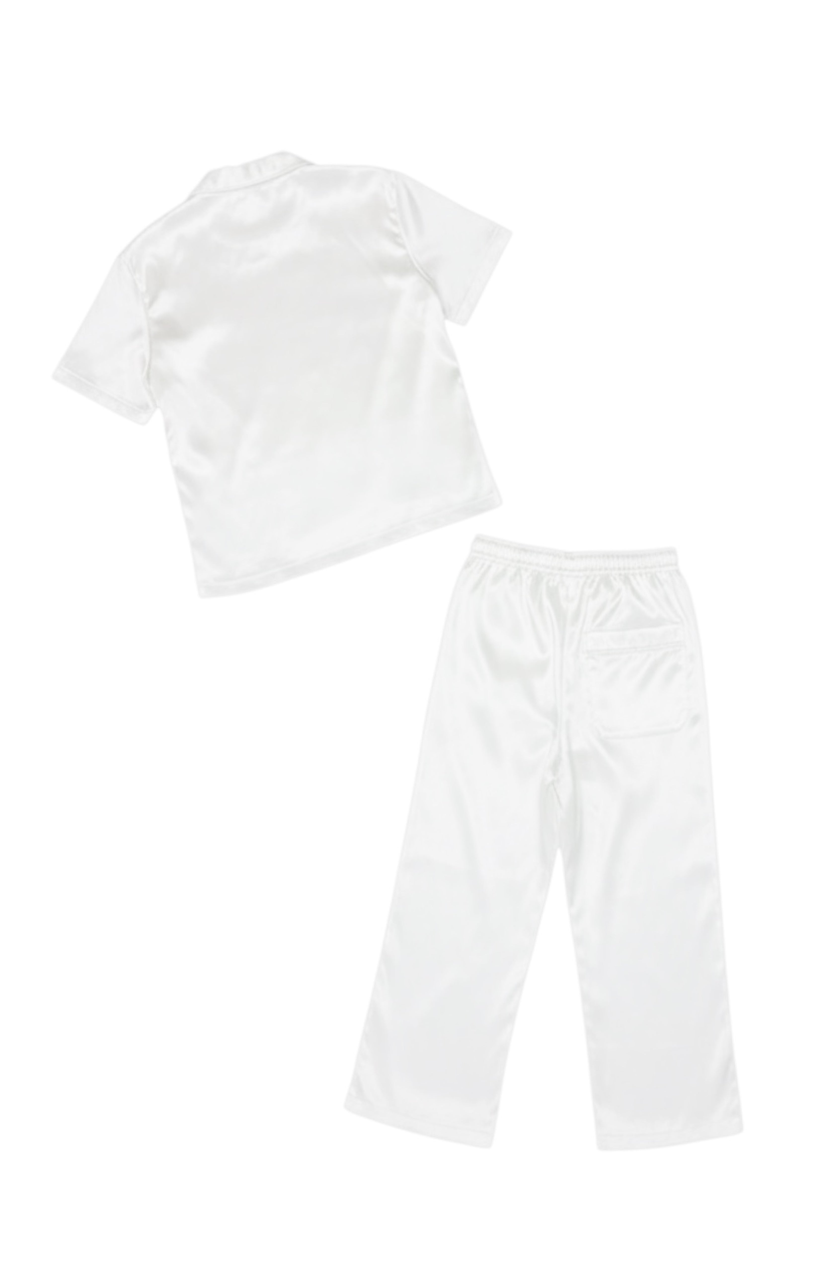 Rare limited edition style; White silk satin set; Top is a short-sleeved, collared button down top with front pocket, white iridescent buttons, and button closure; Pants have drawstring, elastic waistband, pockets, notched hem detail, and tie closure