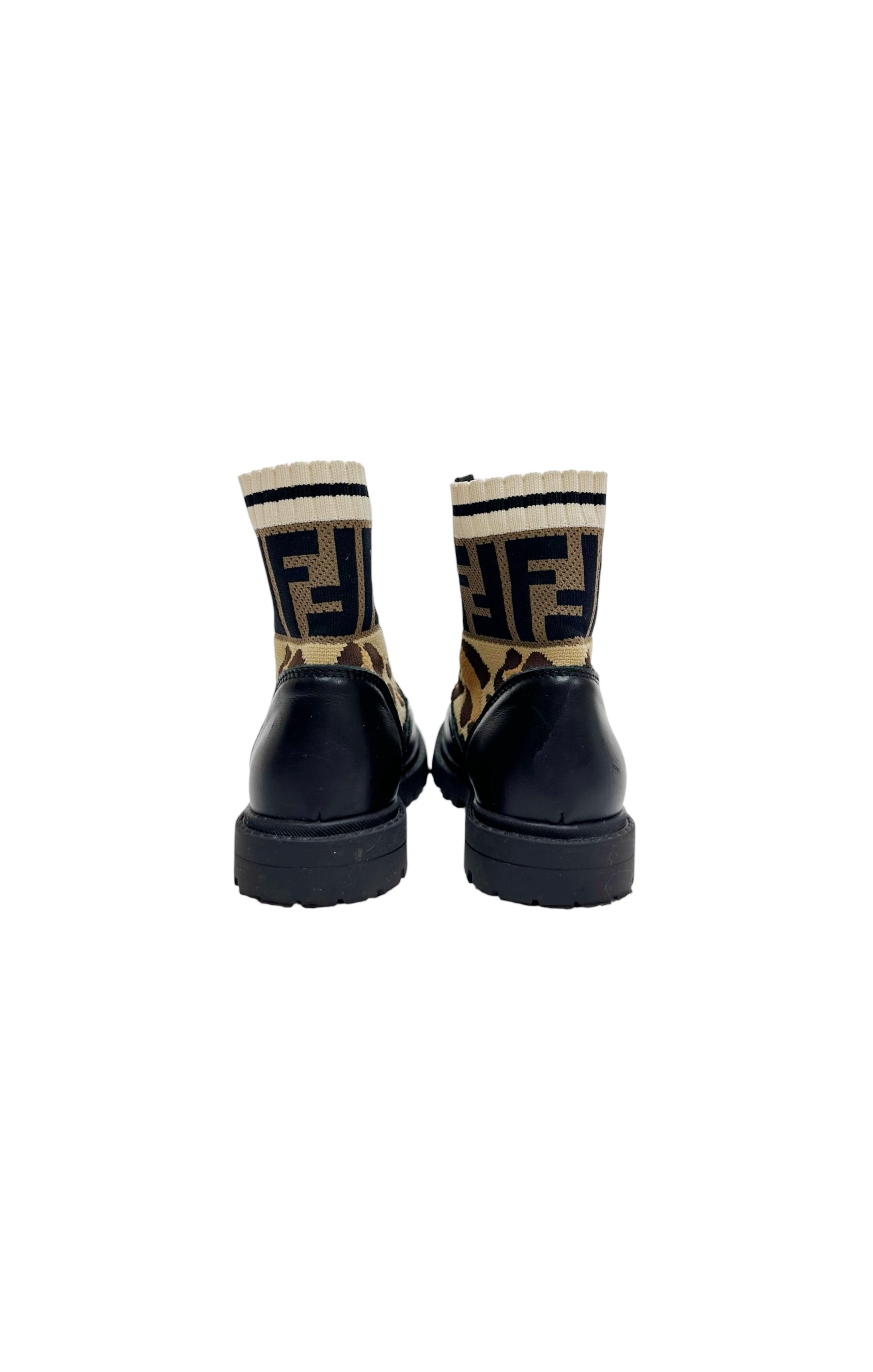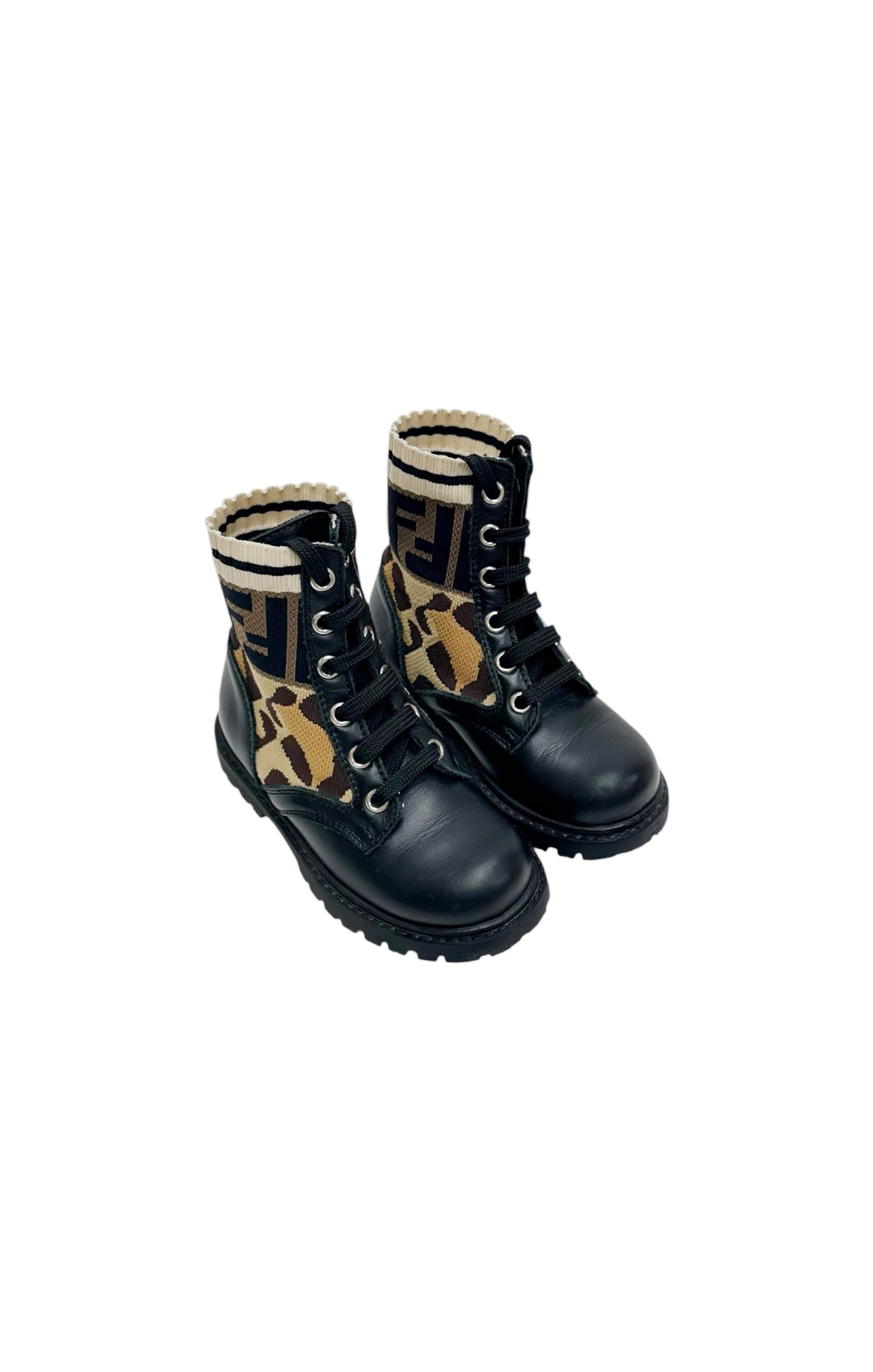 Rare limited edition style; Black leather combat booties with tonal brown and black, jacquard embroidered leopard and FF Zucca logo sock detailing, cream and black striped trim, silver-tone metal hardware, and black rubber lug soles; Tie closure