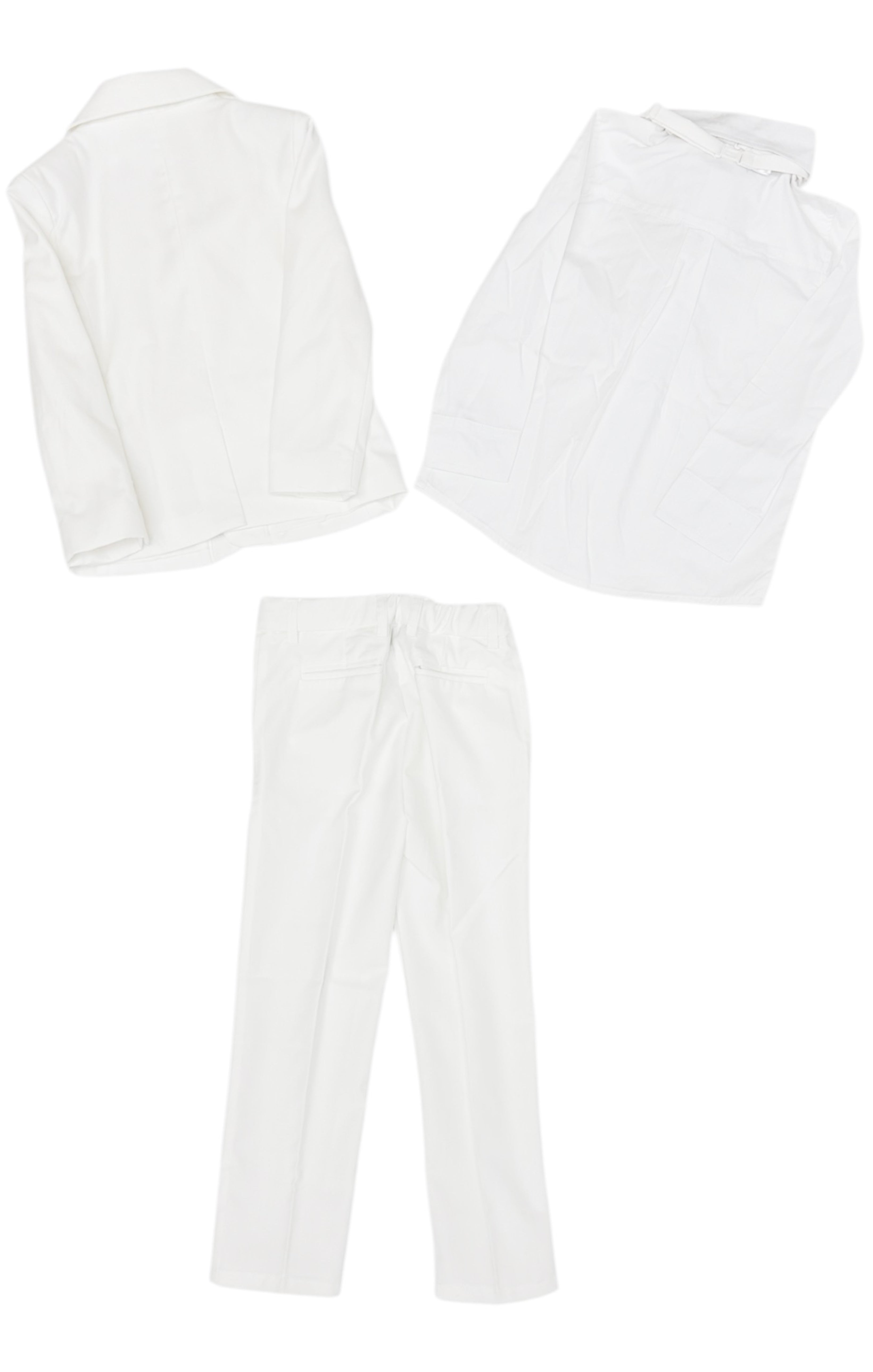 5-piece set; Ivory single-breasted suit jacket with structured shoulders, pockets, back hem vent, and button closure; White collared button down shirt with button closure and comes with optional ivory bow tie or tie; Ivory pleated trousers with pockets, belt loops, and zipper fly/button closure