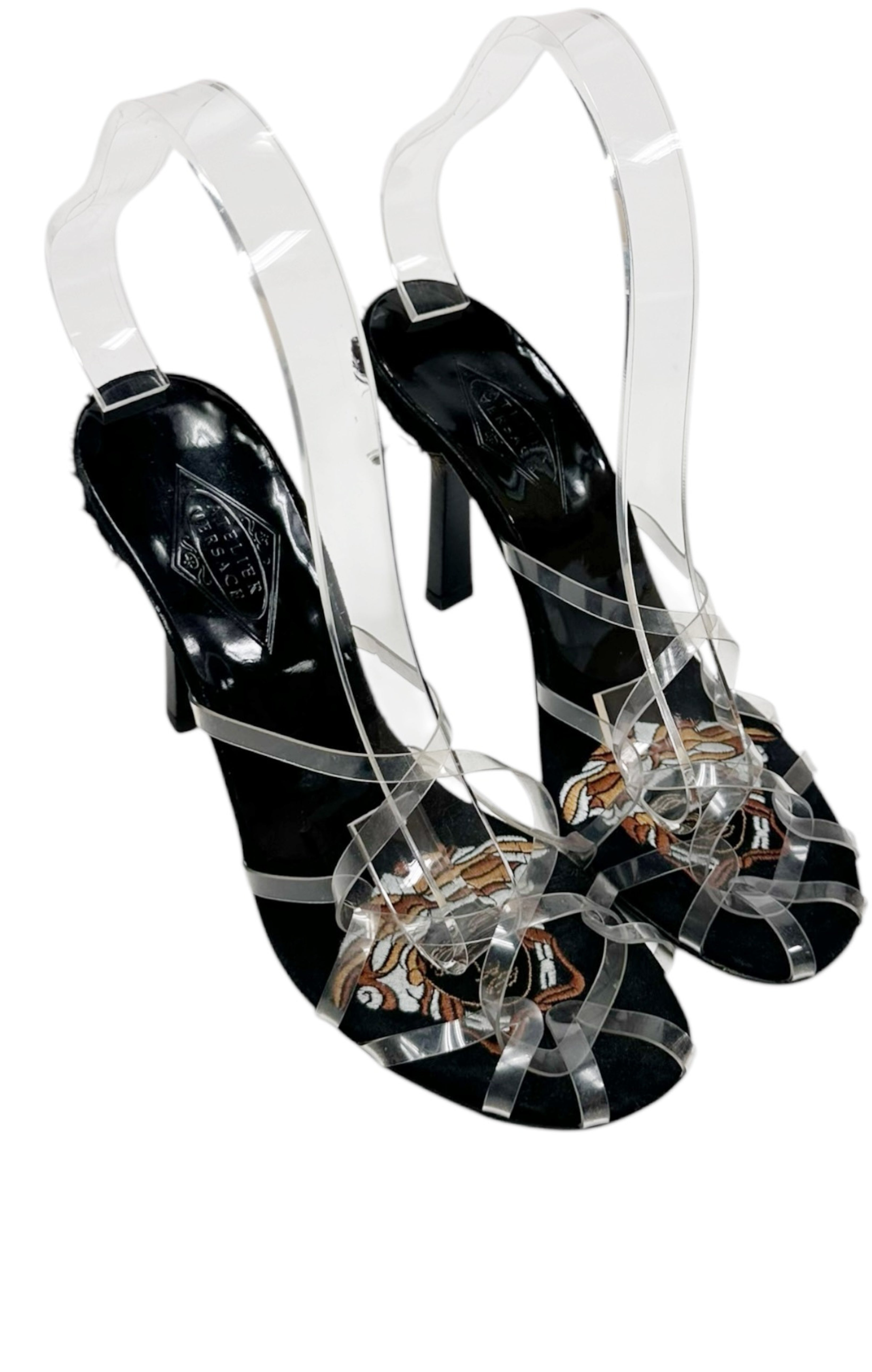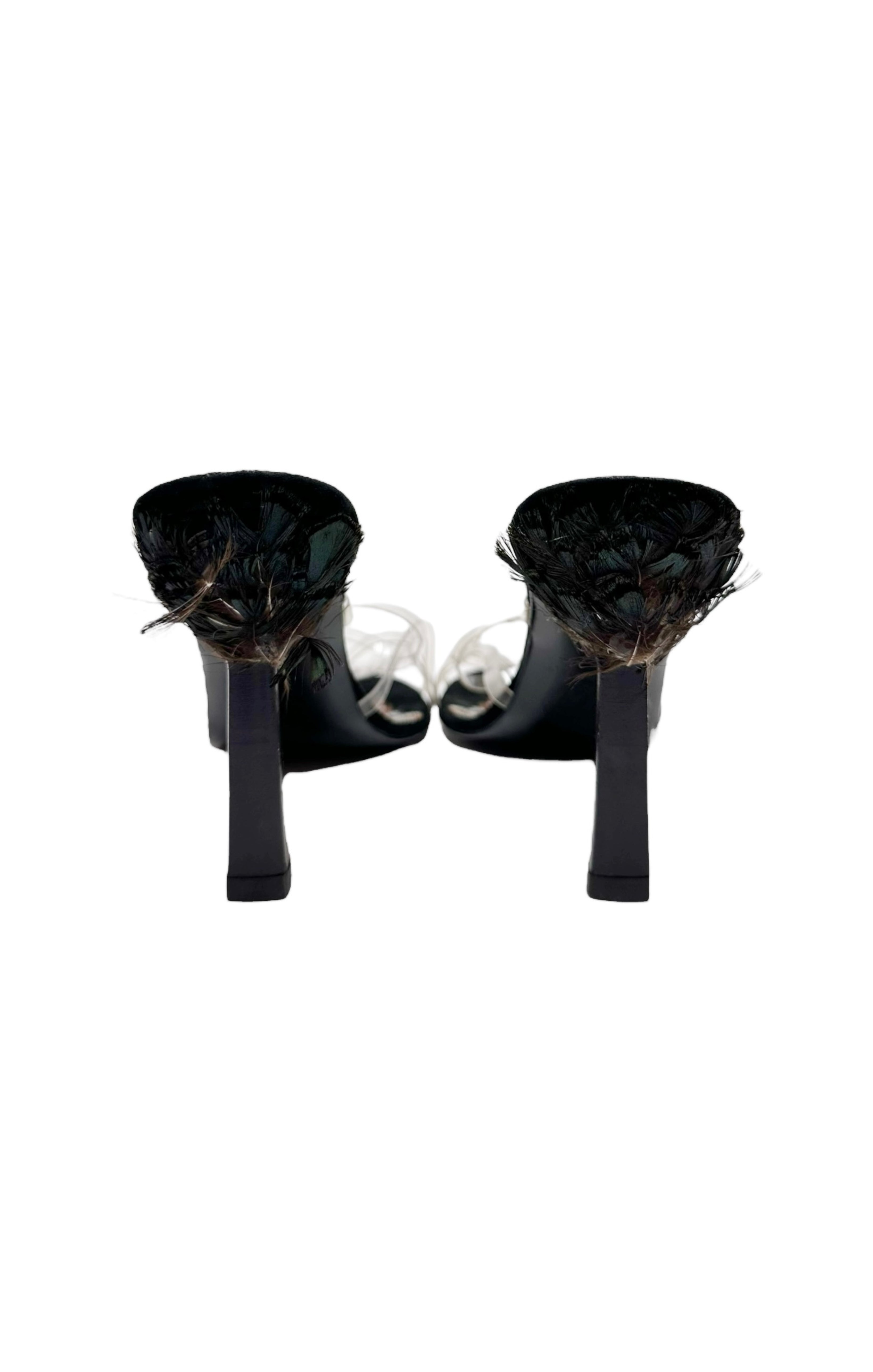RARE limited edition style from F/W 1999; Black suede leather mule pumps with peacock feather embroidery on heel, white PVC woven foot strap detailing, and logo embroidered foot bed; 4" heel