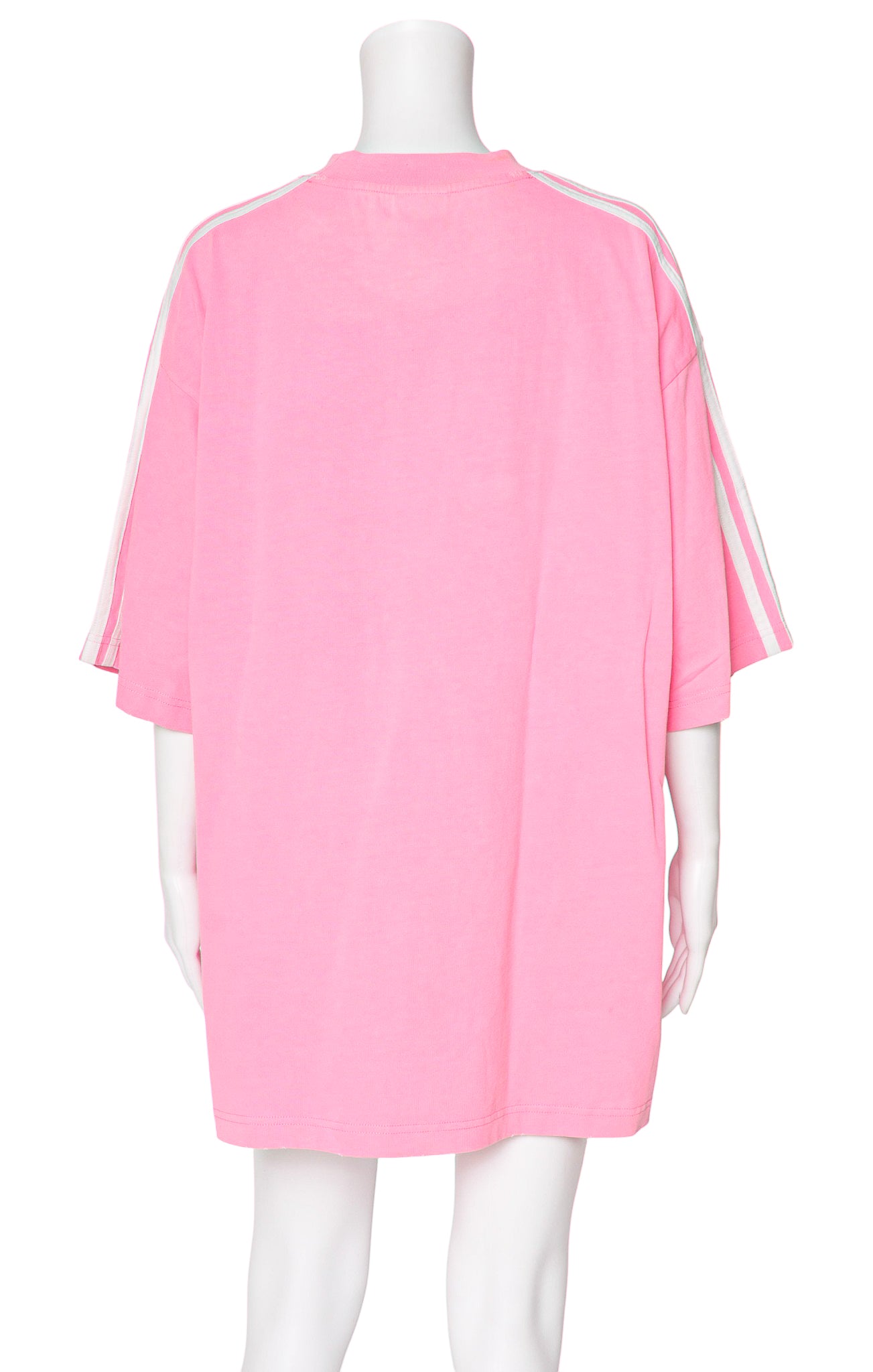 Limited edition style; Neon pink distressed t-shirt with white embroidered logo stripes and white printed logo