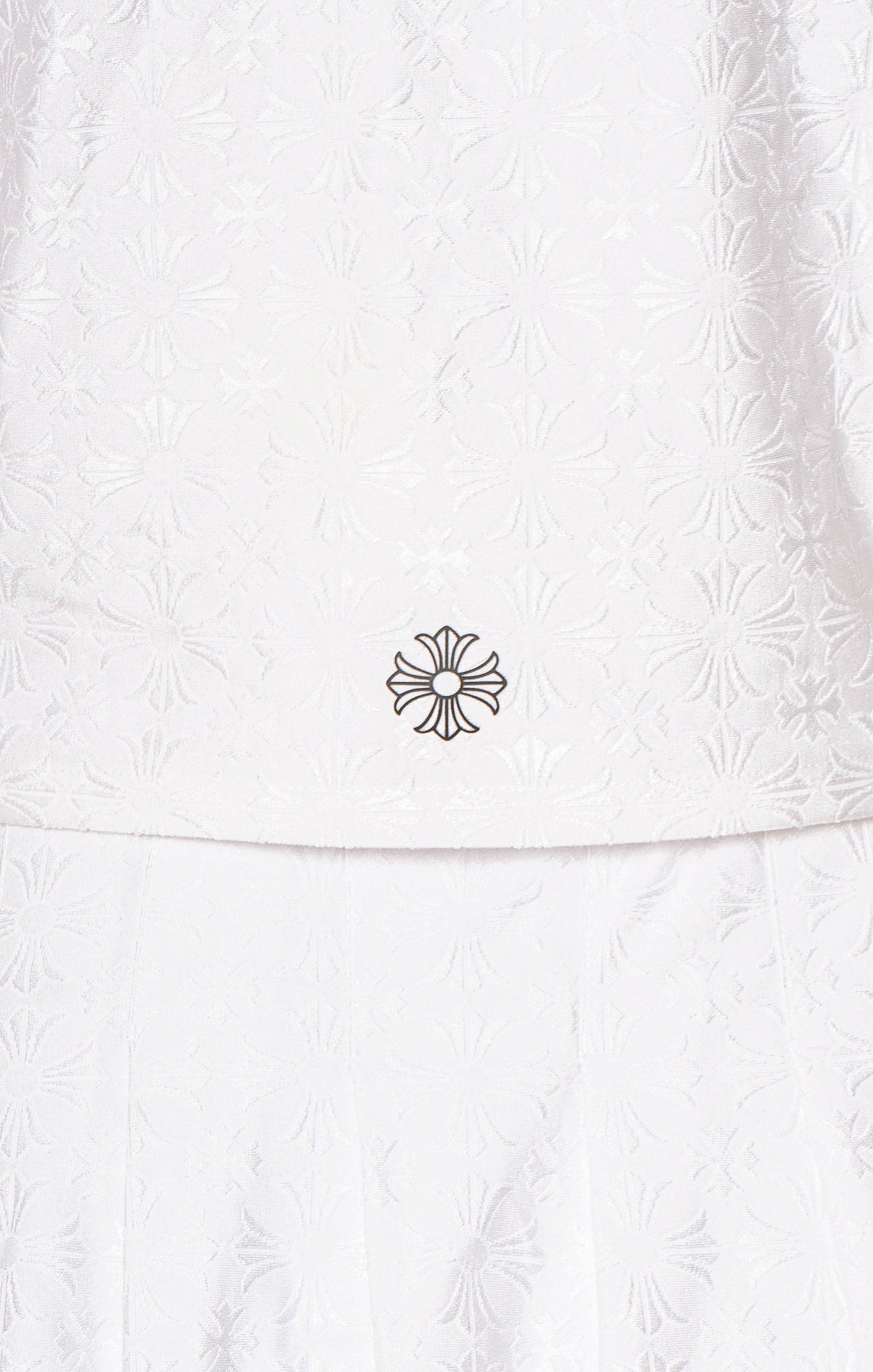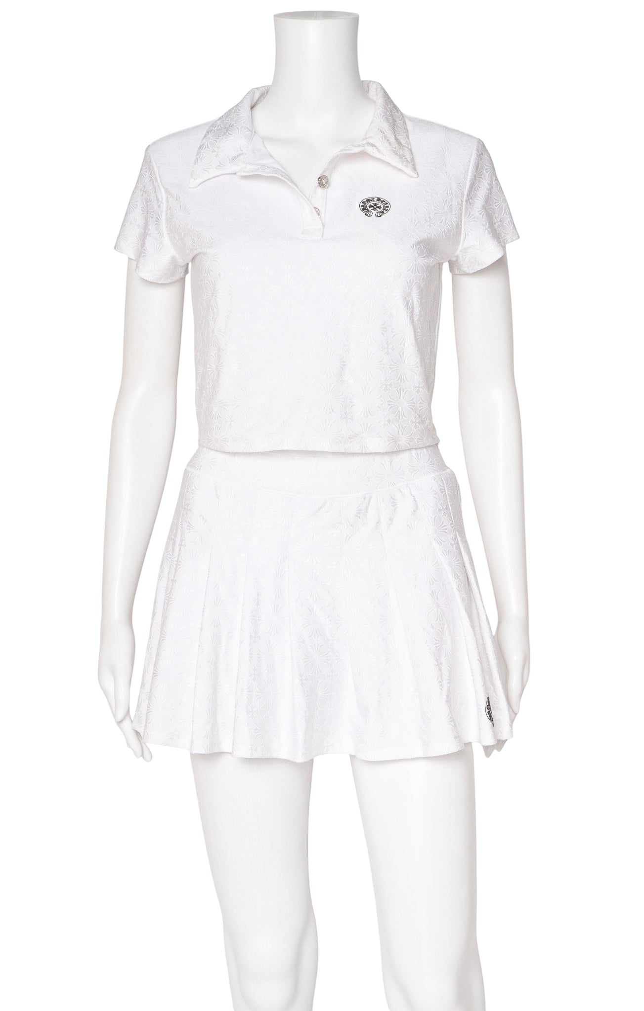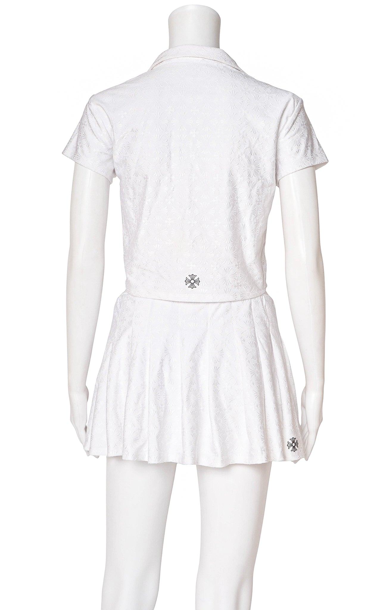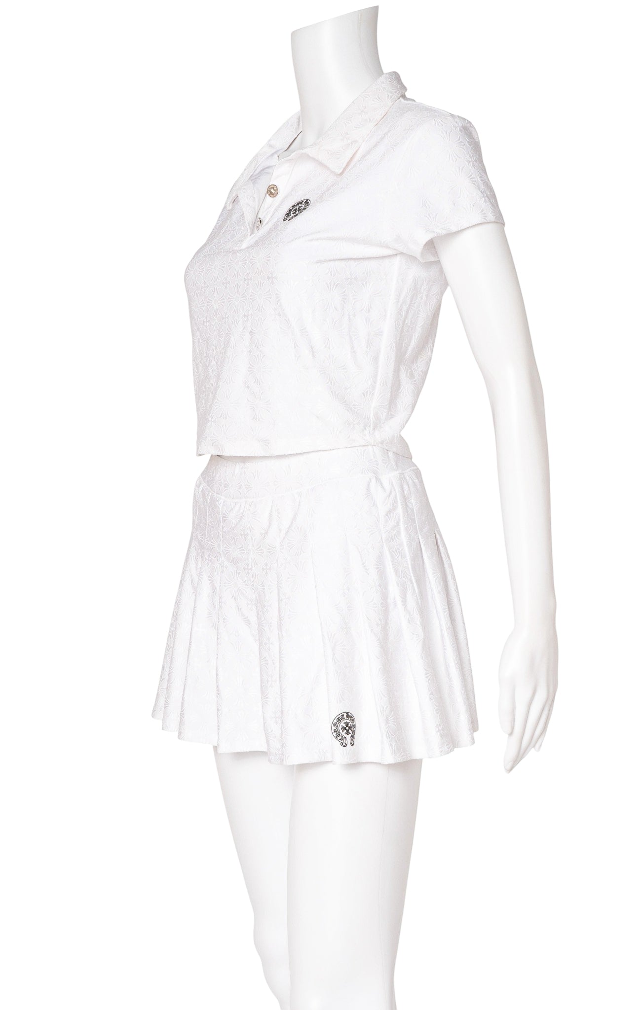 RARE limited edition style; Metallic white with embroidered logo pattern, cropped stretchy tennis polo and matching skort; Top is a cropped, short-sleeved polo shirt with collar, black rubber printed logos, and silver-tone metal logo buttons; Skort is high-waisted with pleating, black rubber printed logos, built-in interior shorts, and elastic waistband