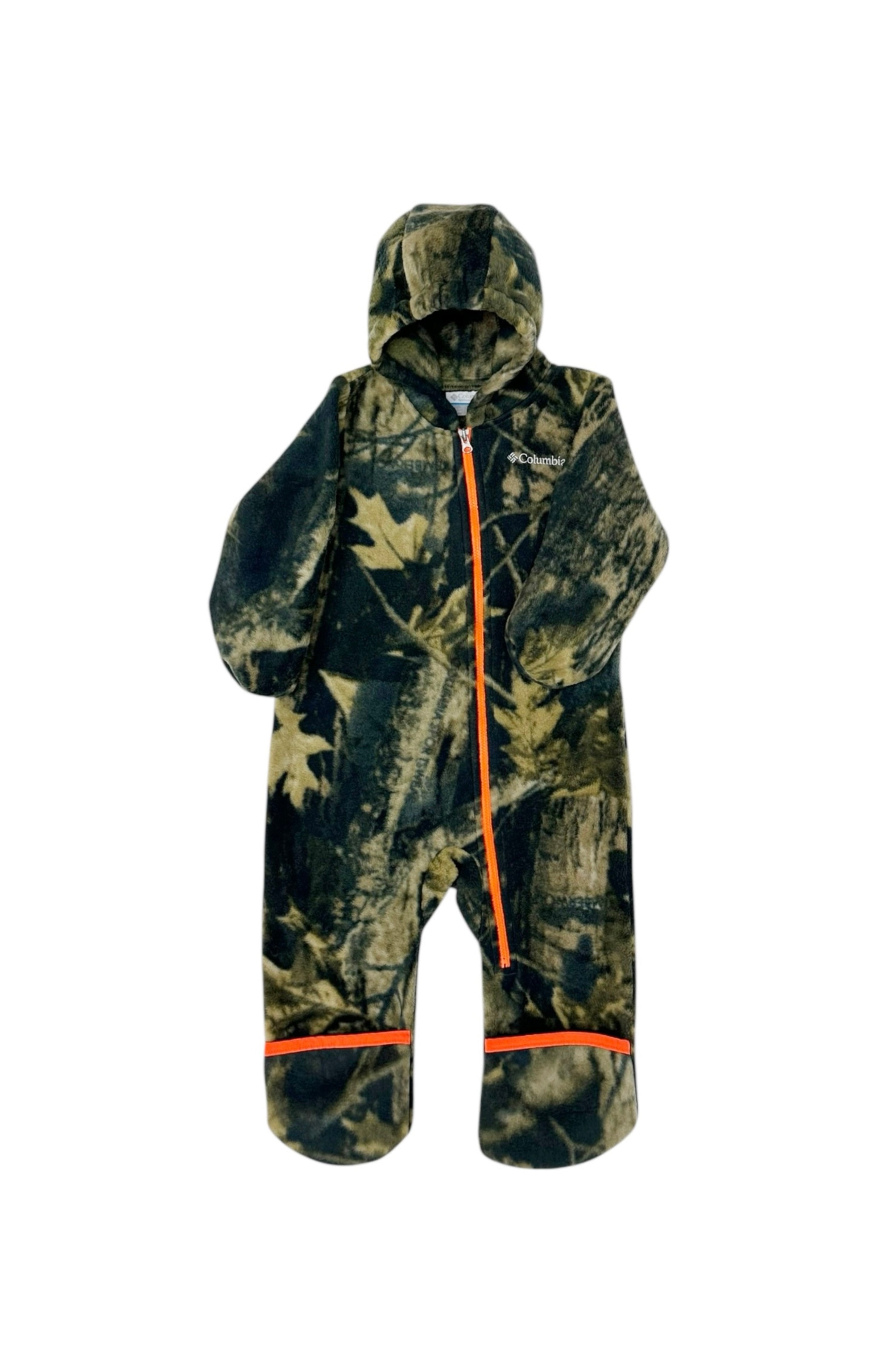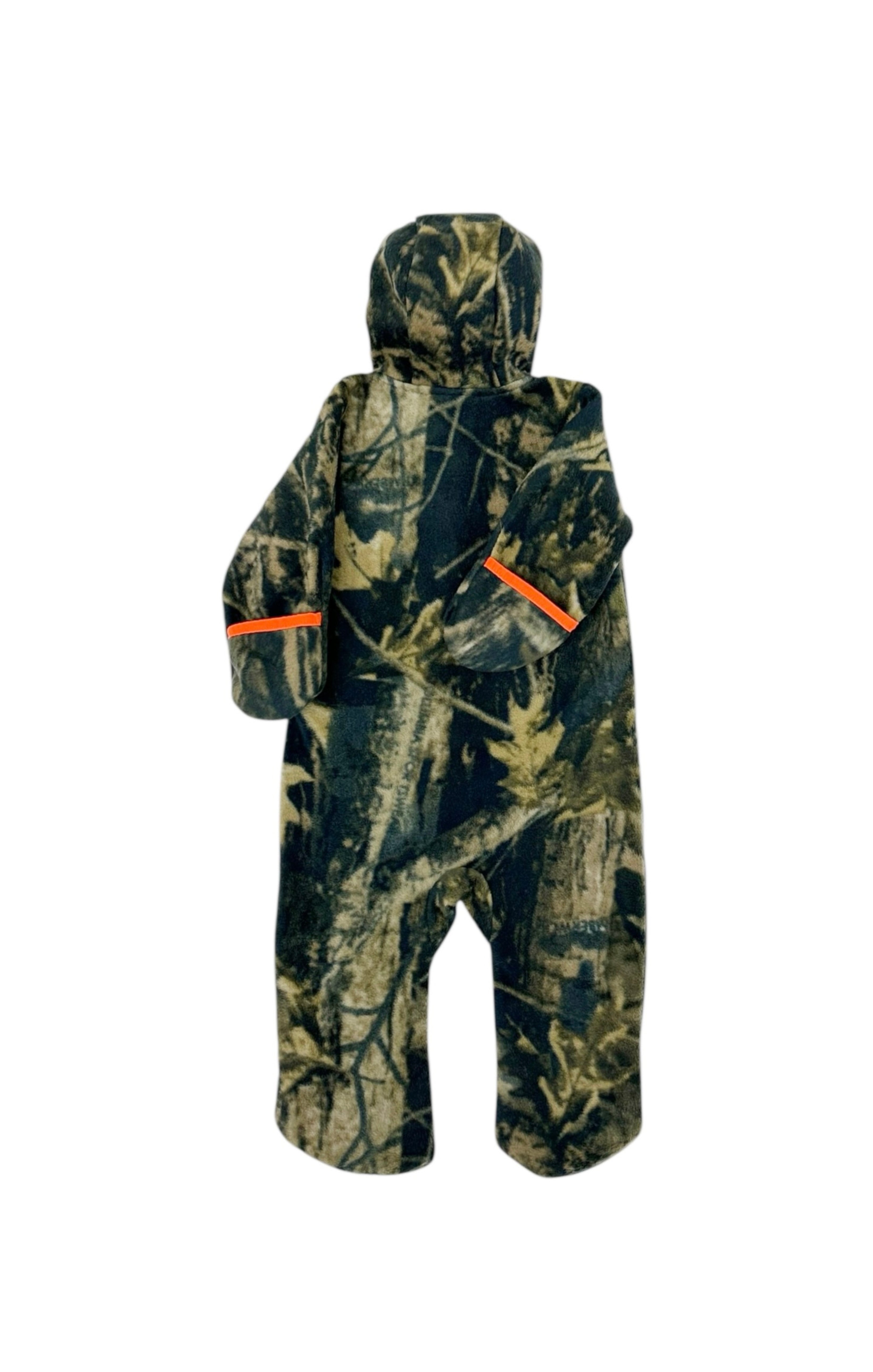 Olive green, taupe and black camo fleece, hooded onesie with neon orange elastic trim and zipper, optional mitten and feet covers, white embroidered logo, brushed gunmetal hardware, and bias zipper closure
