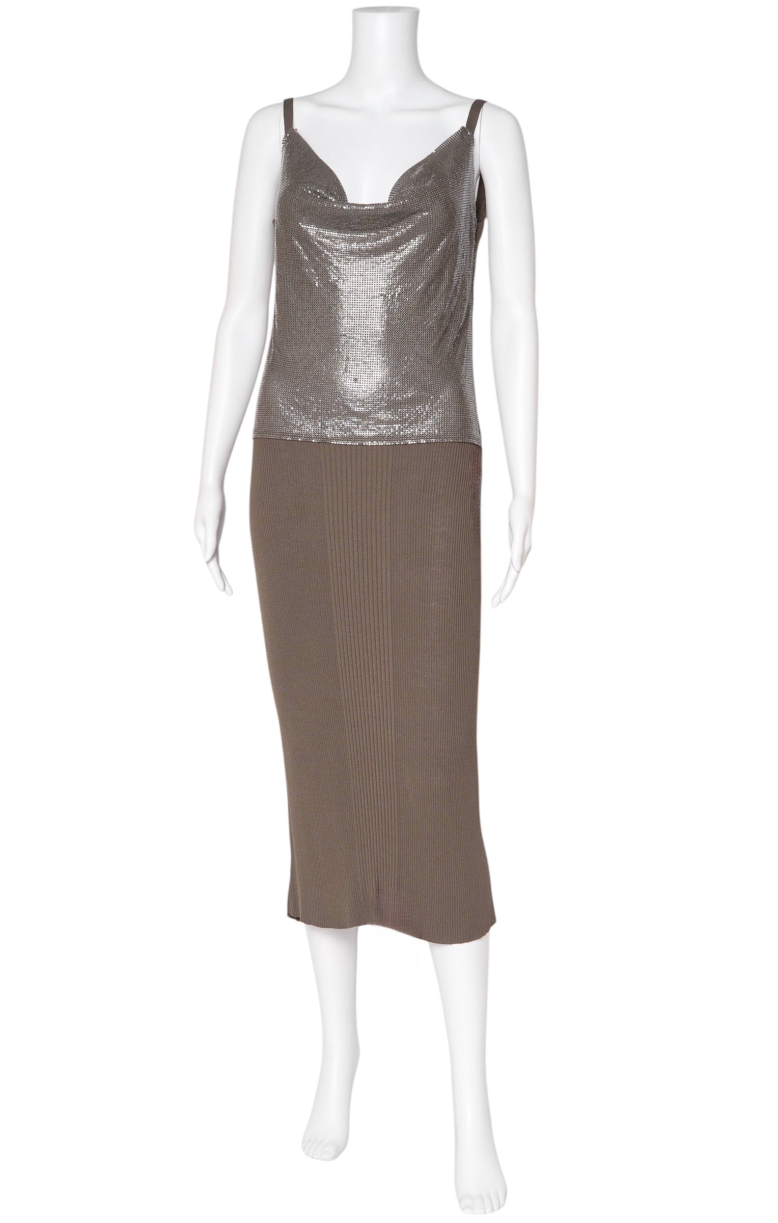 RARE limited edition style; Charcoal chainmail with mesh lining and ribbed knit midi/maxi dress with cowl neckline, open back and tie back detail with long ties; Tie closure