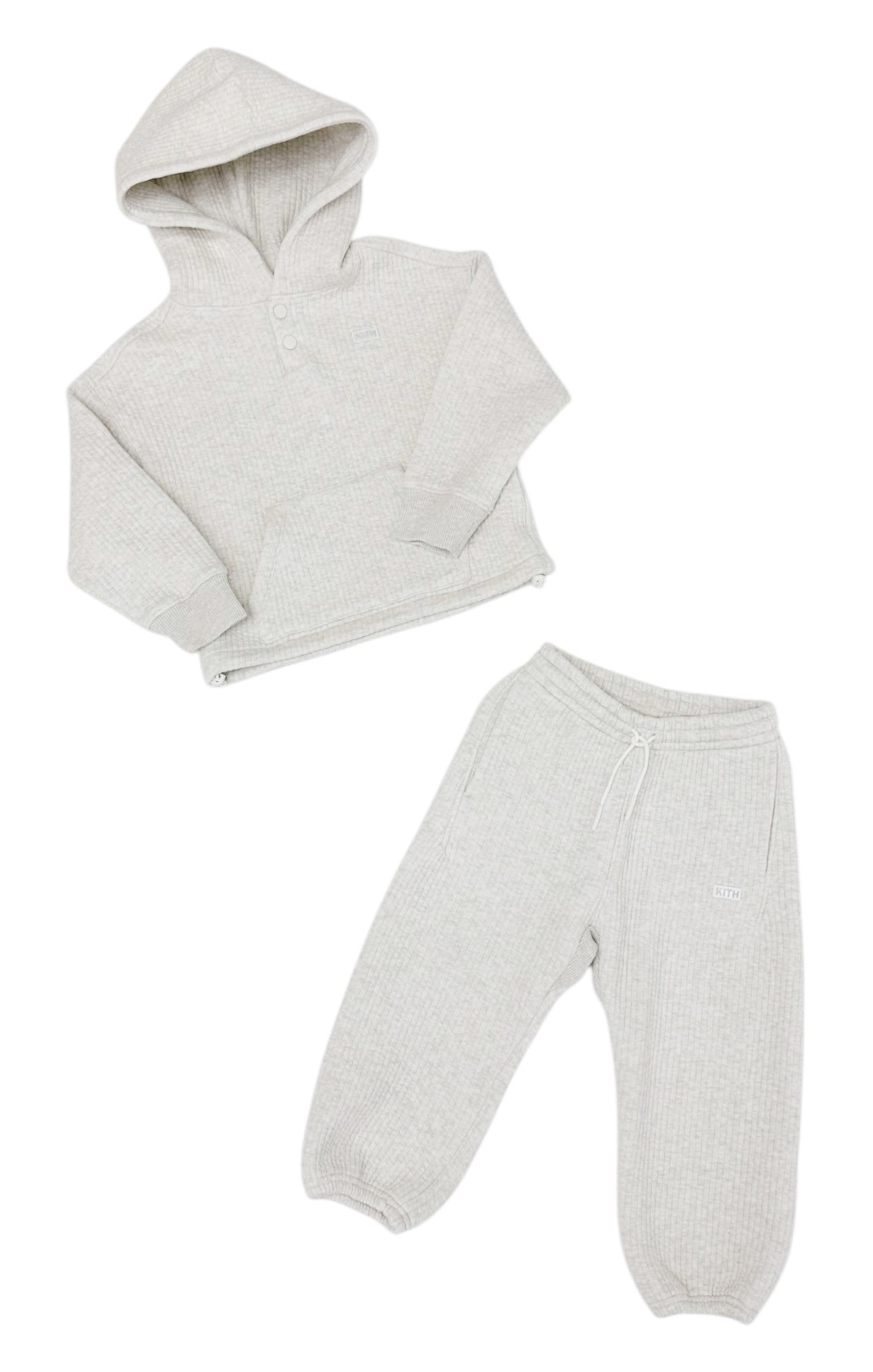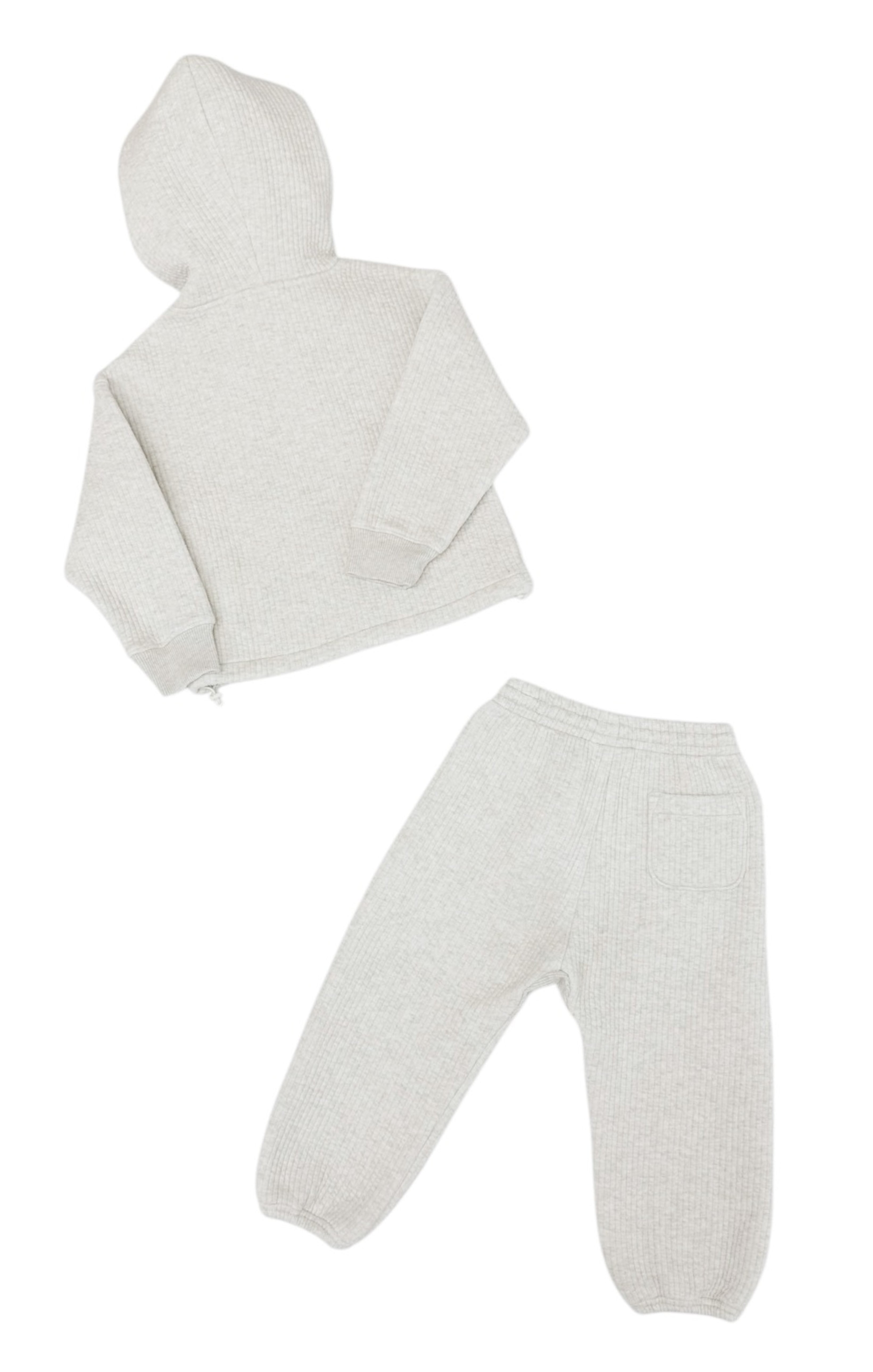 Oatmeal ribbed sweatshirt and matching sweatpants; Top is a henley pullover sweatshirt with hood, front kangaroo pocket, white and cream embroidered logo patch, cream metal logo hardware, and drawstring adjustable hem; Pants have drawstring elastic waistband, white and cream embroidered logo patch, multi pockets, and elastic ankles