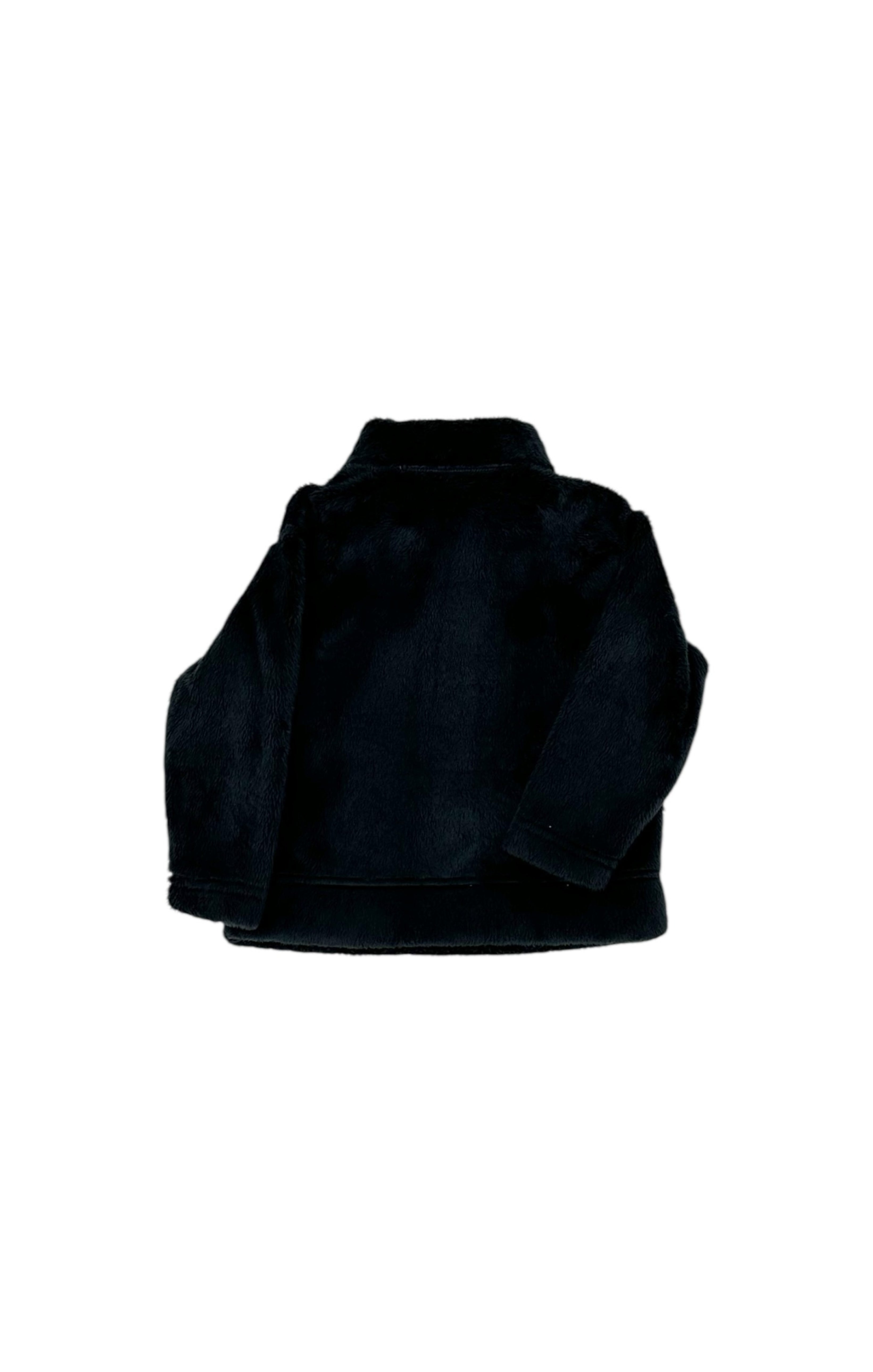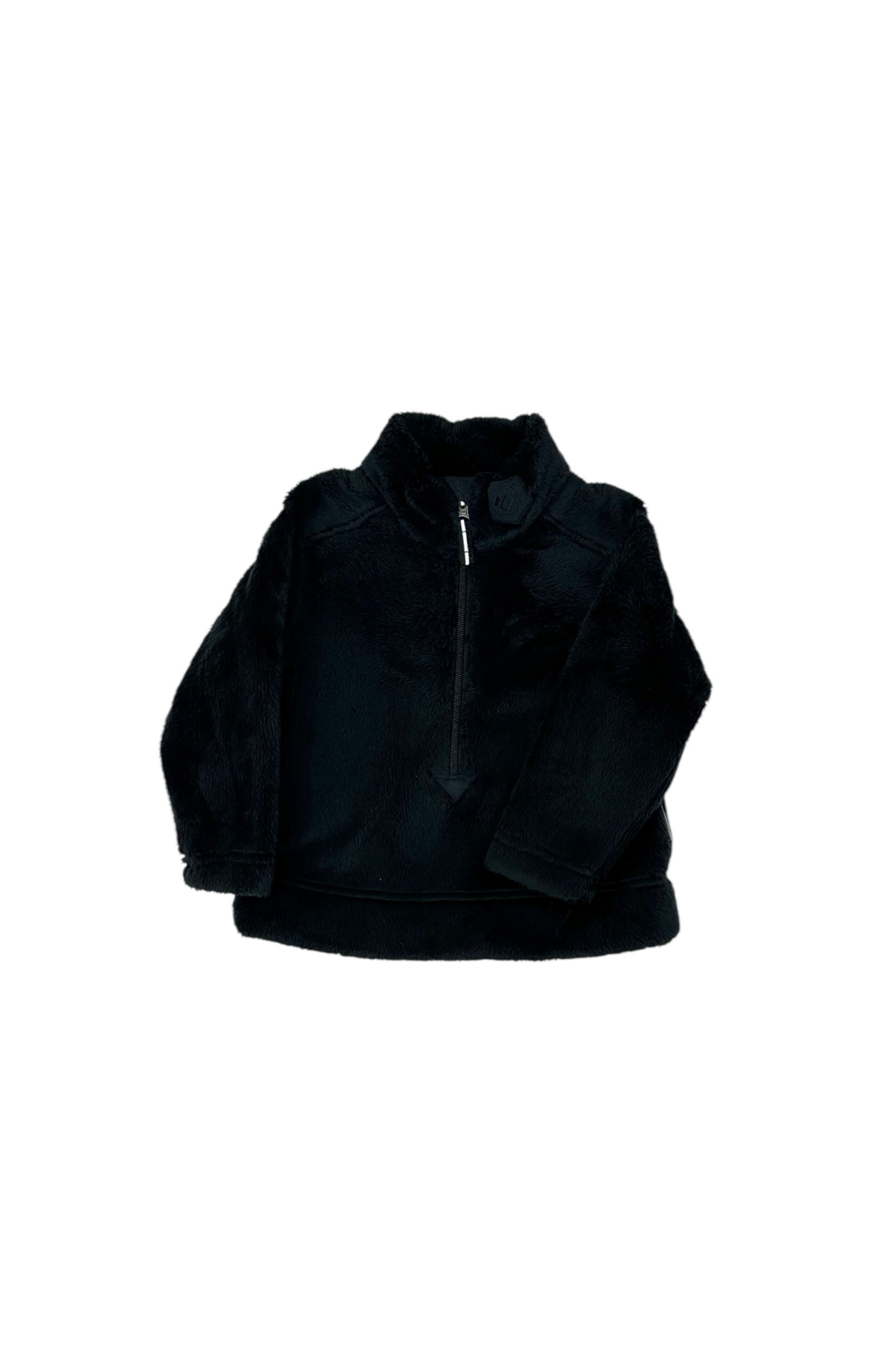 Black fleece, quarter-zip pullover sweatshirt or jacket with black/grey zipper toggle, grey/white embroidered logo patch, and zipper closure