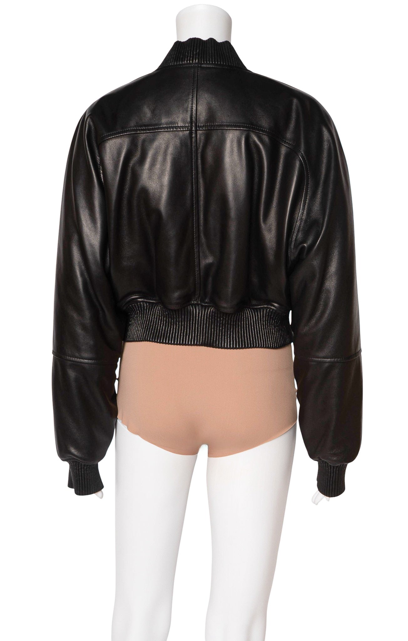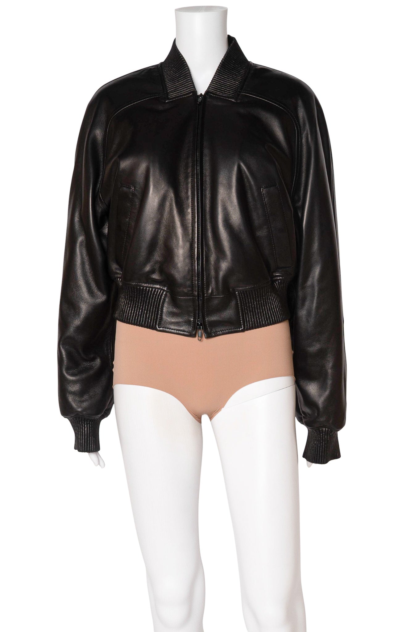 Rare limited edition style; Black semi-cropped leather bomber jacket with quilted interior lining, ribbed trim, seam detailing, snap button pockets, and zipper closure