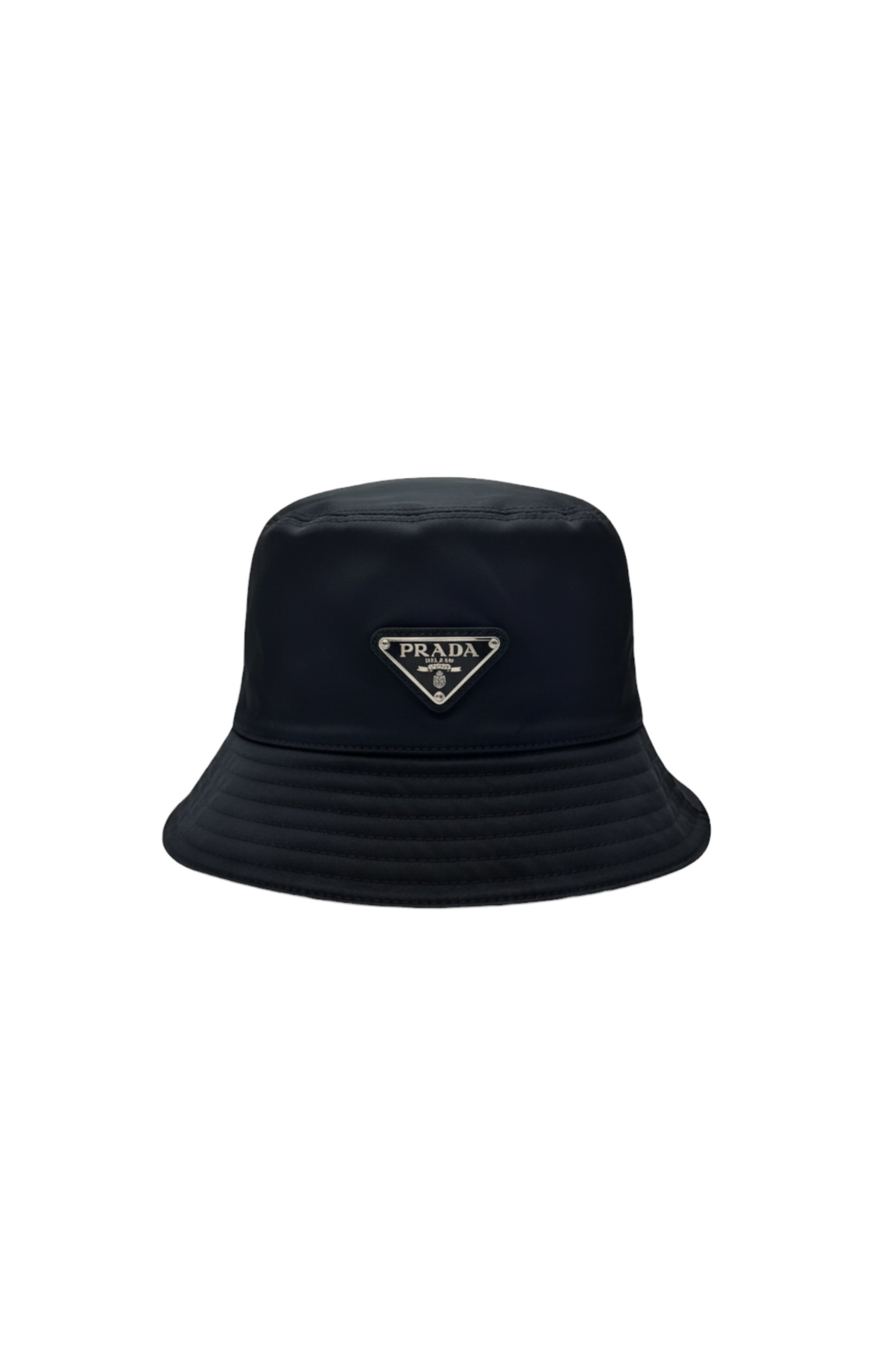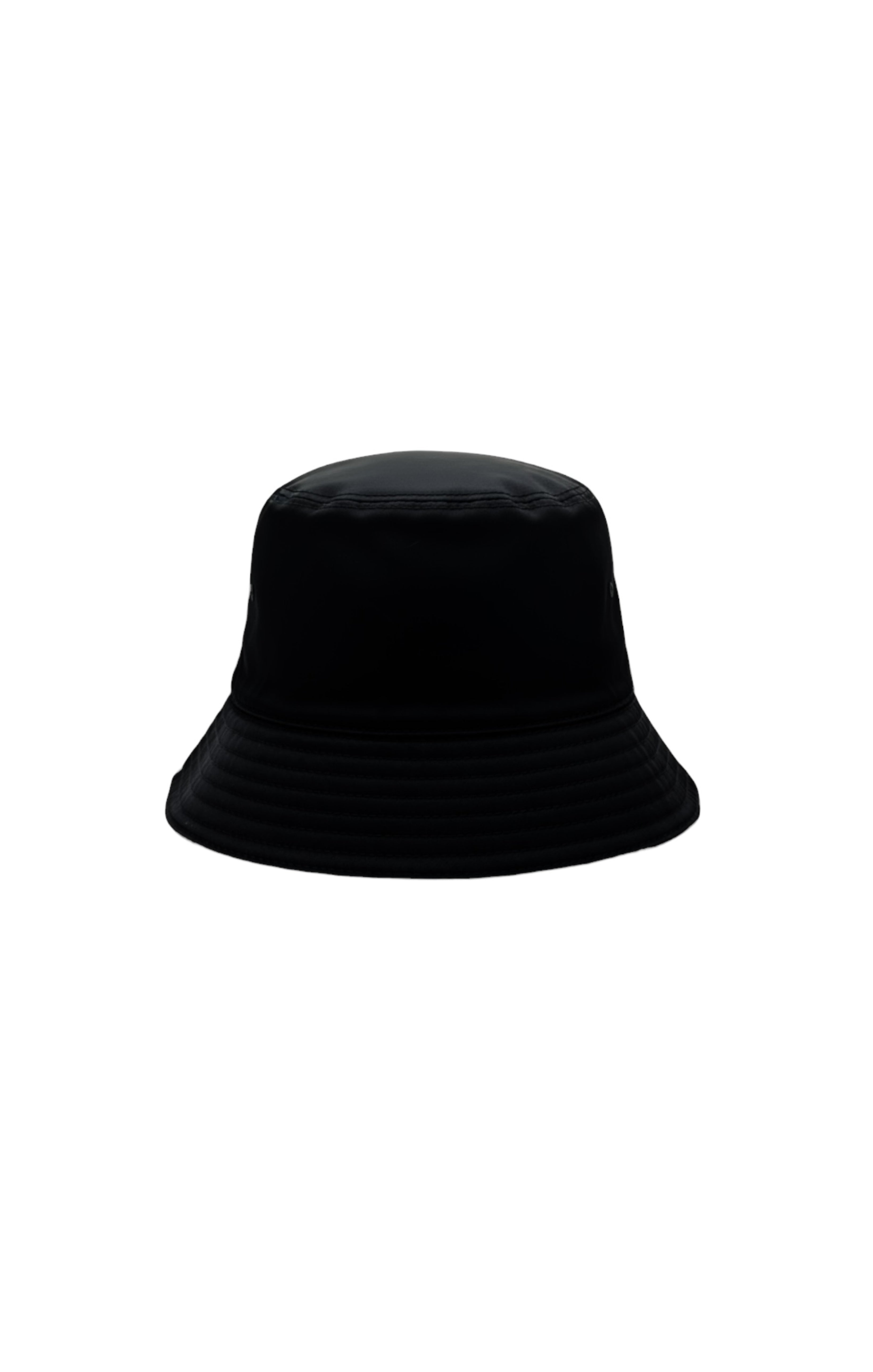 RARE limited edition style; Black nylon bucket hat with ribbed trim detailing, and silver-tone/black metal logo plaque on side