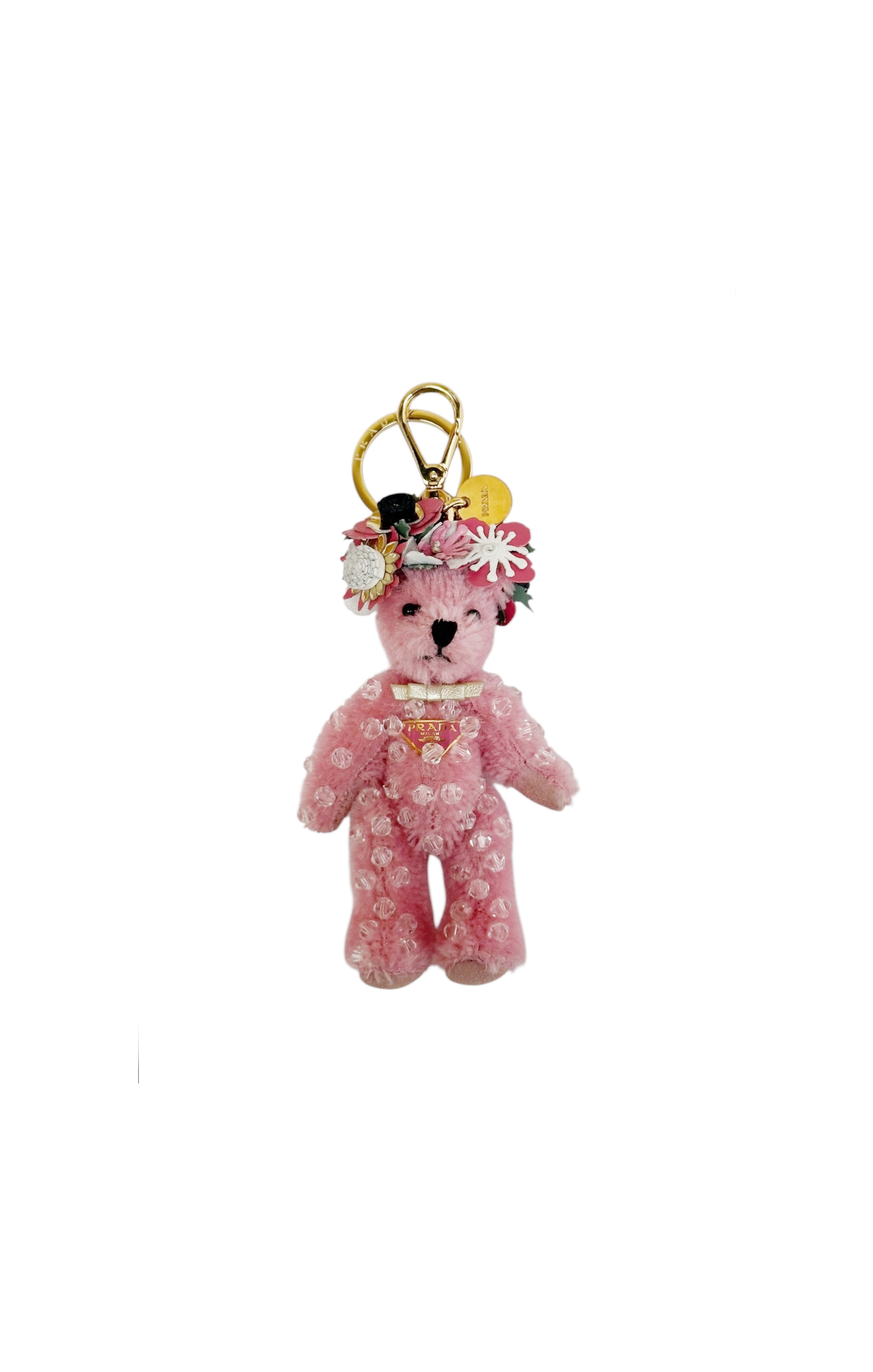 RARE limited edition style; Pink brushed micro teddy bear keychain with clear beaded embroidery, multicolored leather flower crown embroidery, black trim and beaded-embroidered eyes, pink and gold-tone metal logo plaque, and gold-tone metal logo engraved fasteners