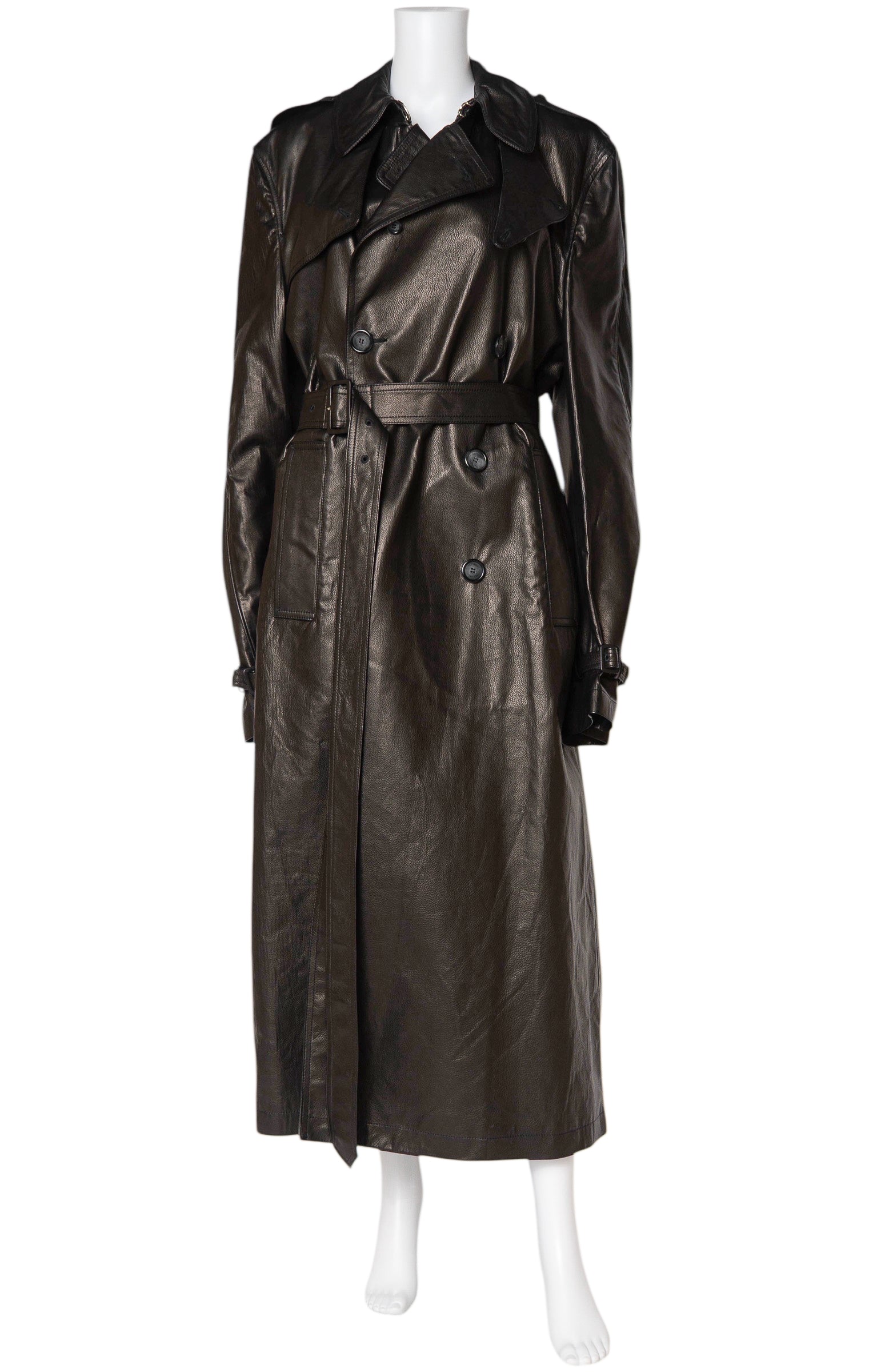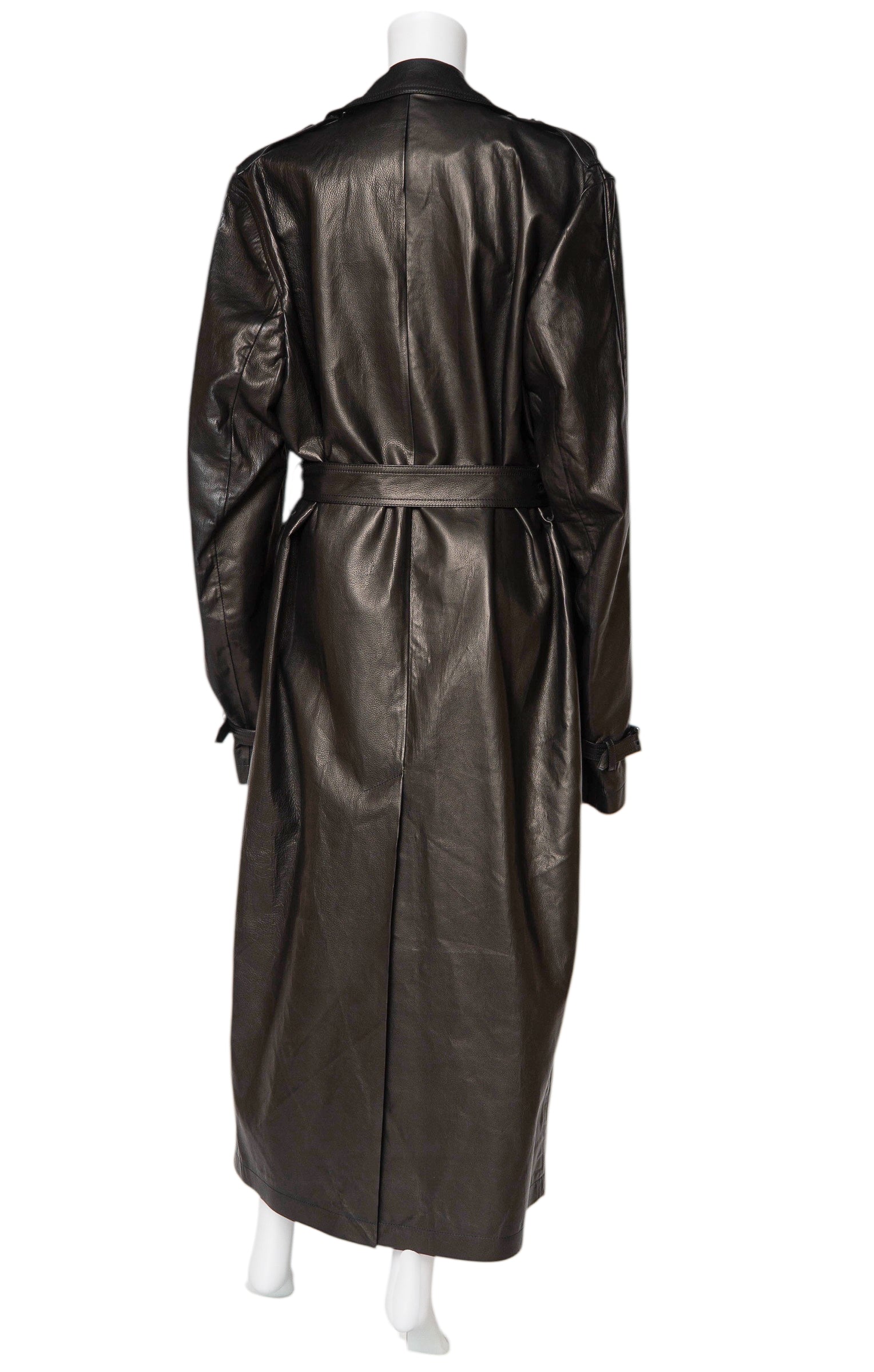 Limited edition style; Black leather double-breasted trench coat with collar, pockets, black/grey tort-like buttons, silver-tone metal hardware, belted sleeves and waist, and button closure