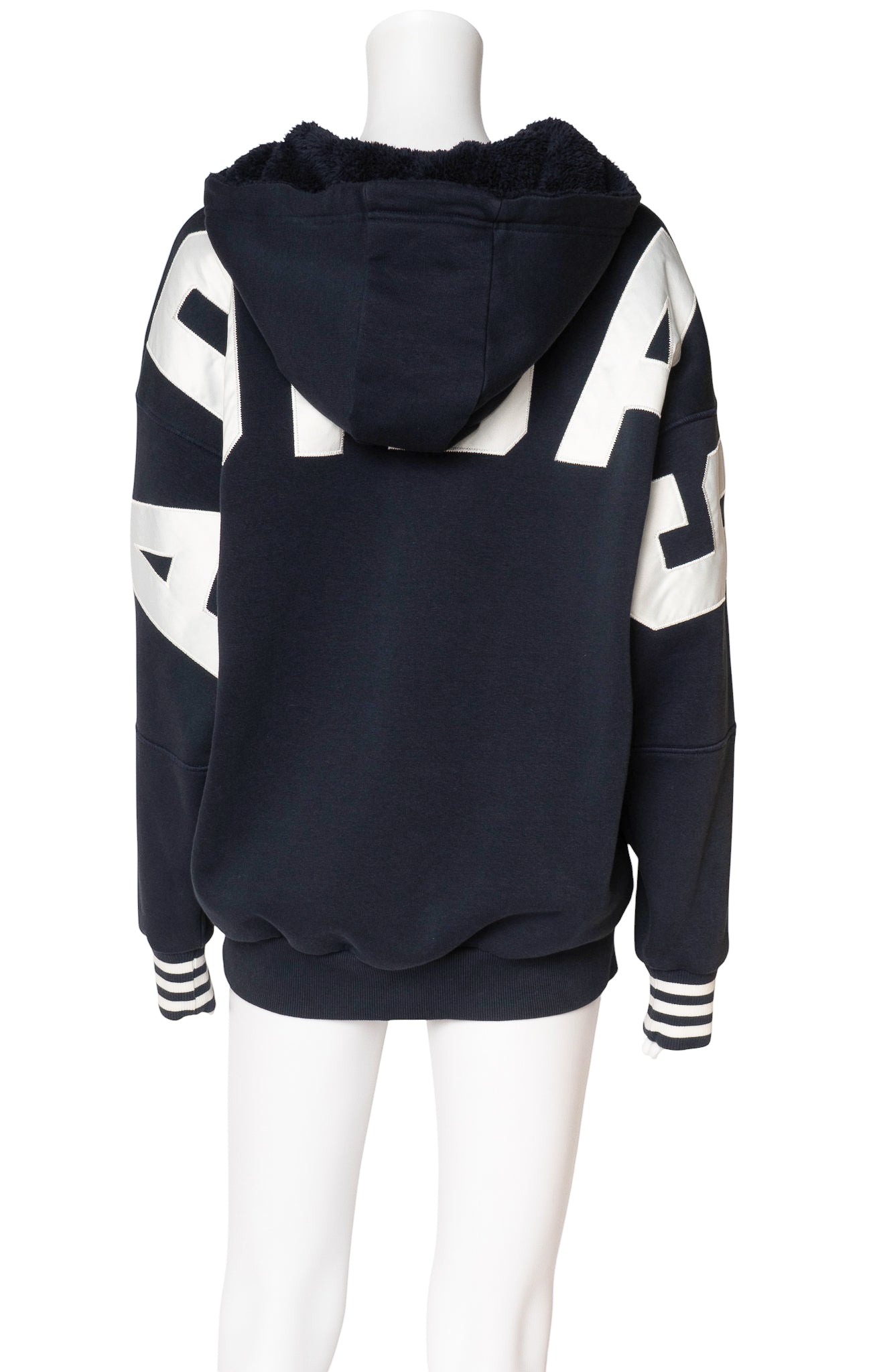 Limited edition style; Navy fleece-lined hoodie sweatshirt with white embroidered stripes and logos, brushed fleece-lined hood, front kangaroo pocket, white drawstring hood, and banded trim