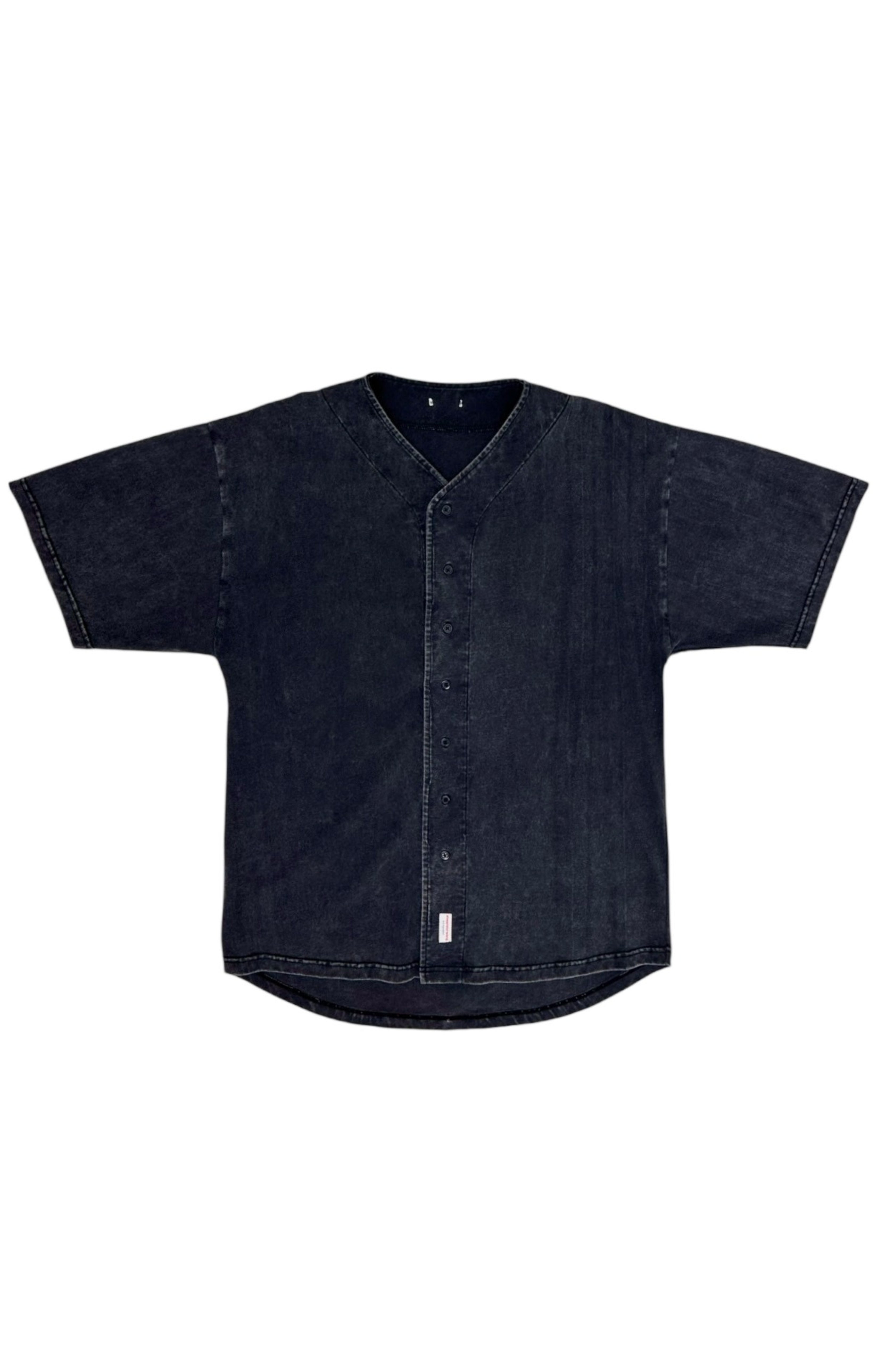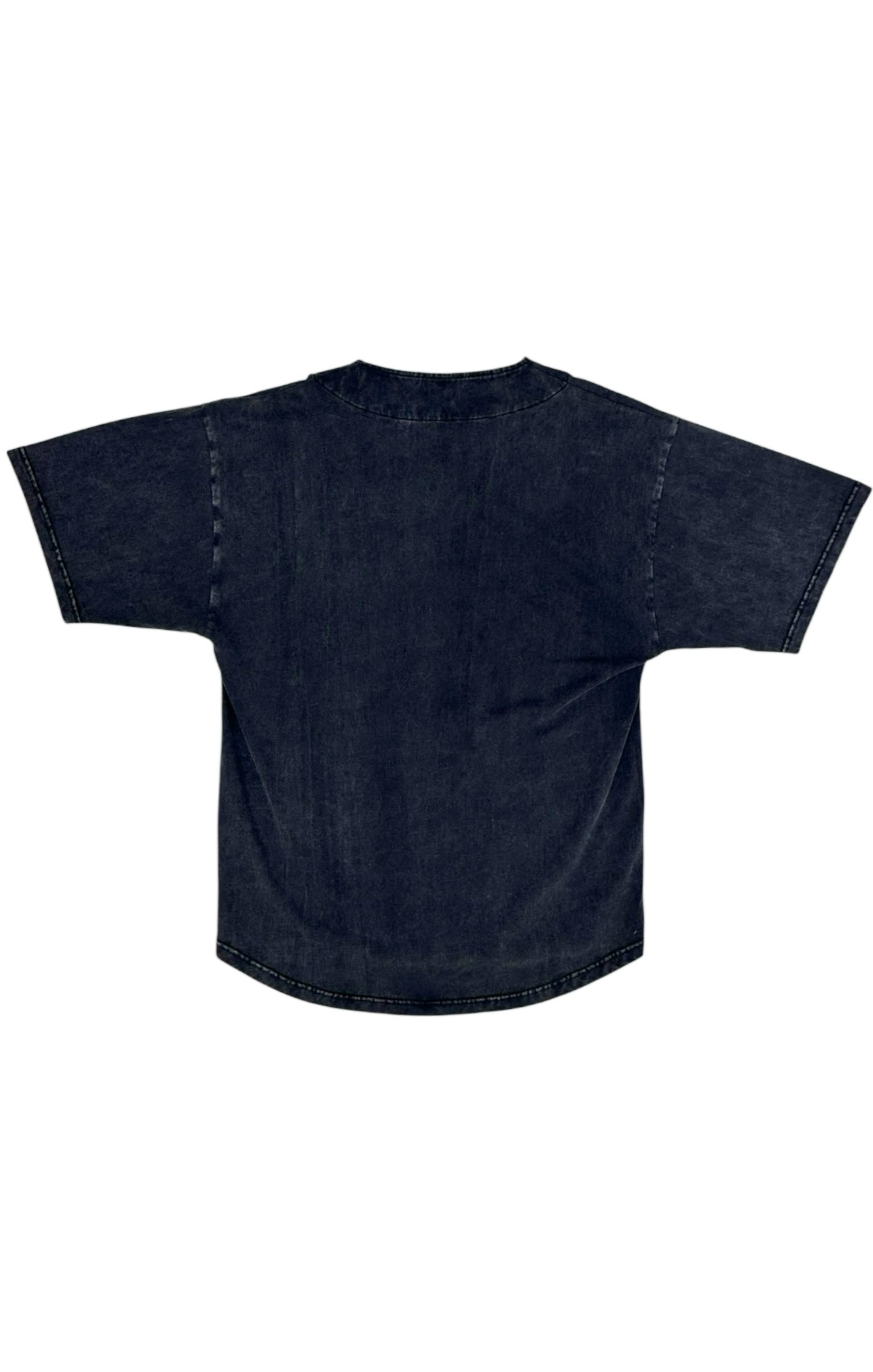 Limited edition style; Charcoal acid wash oversized baseball shirt with collarless v-neckline, red/white/blue embroidered logo patch, and button closure