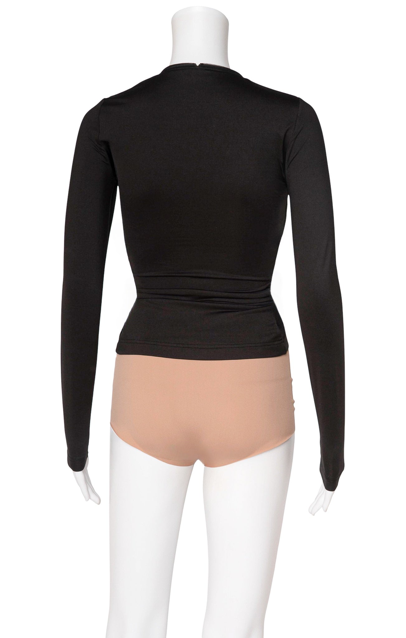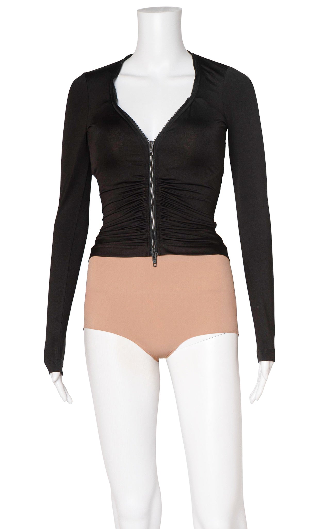Limited edition style; Black neoprene fitted top with built-in cups/underwire, v-neckline, ruching, black metal hardware, and double zipper closure