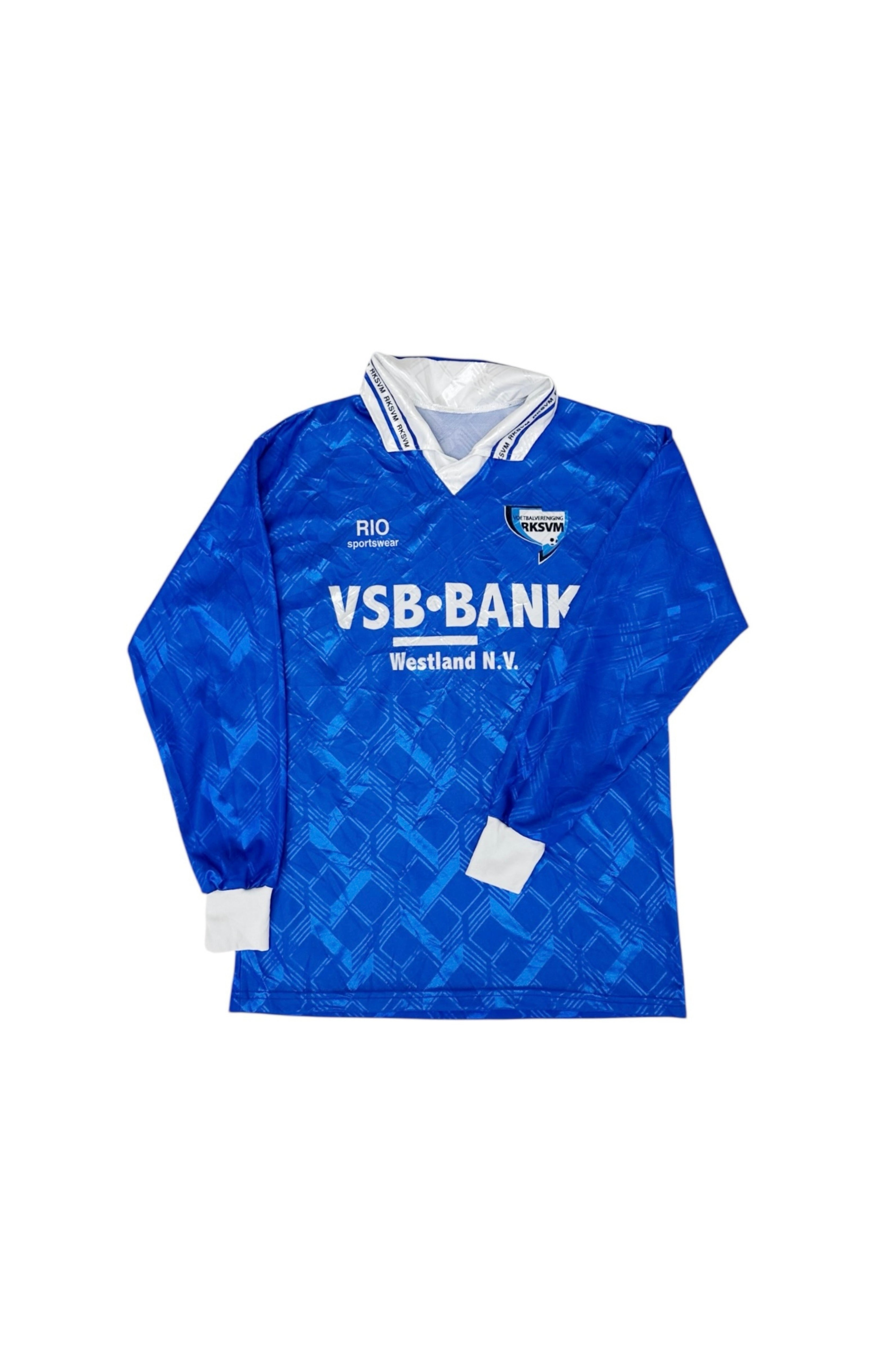 Blue long-sleeved, embroidered jersey with white trim, black/white/blue lettering, and collared neckline