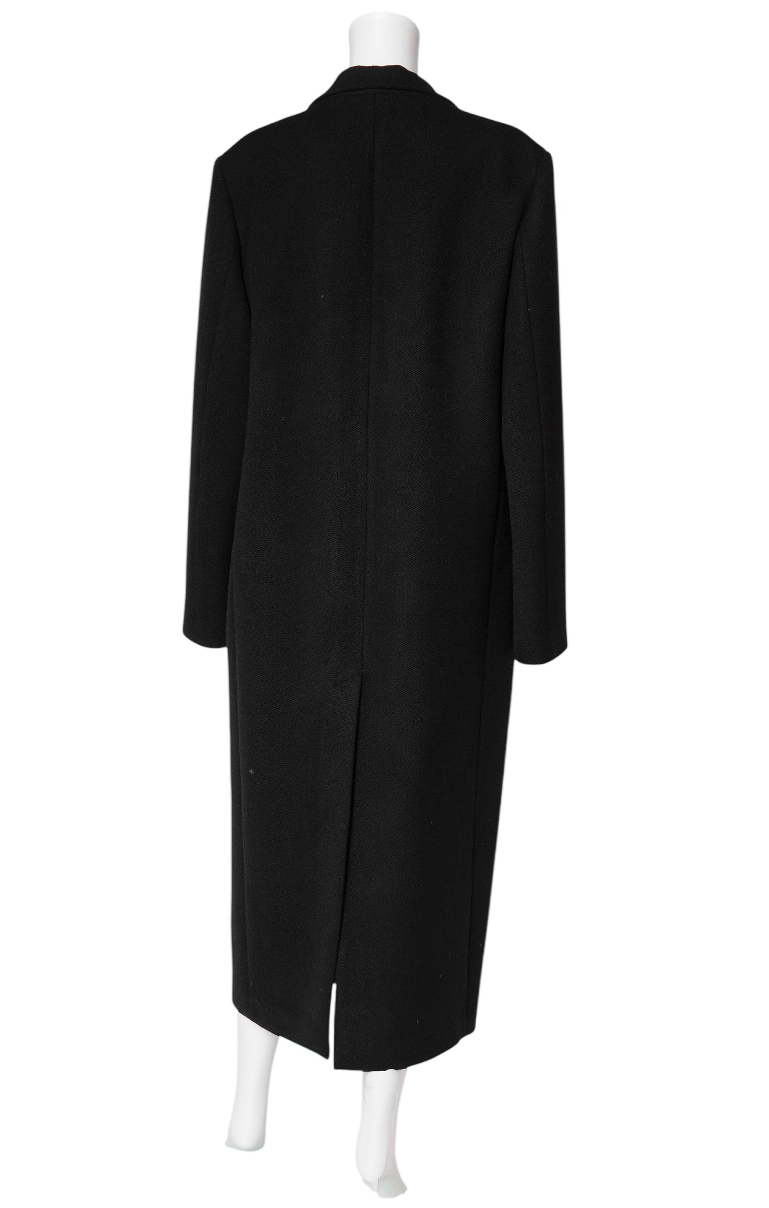 Limited edition style; Black oversized, single-breasted wool peacoat with pockets and hidden buttons; Button closure